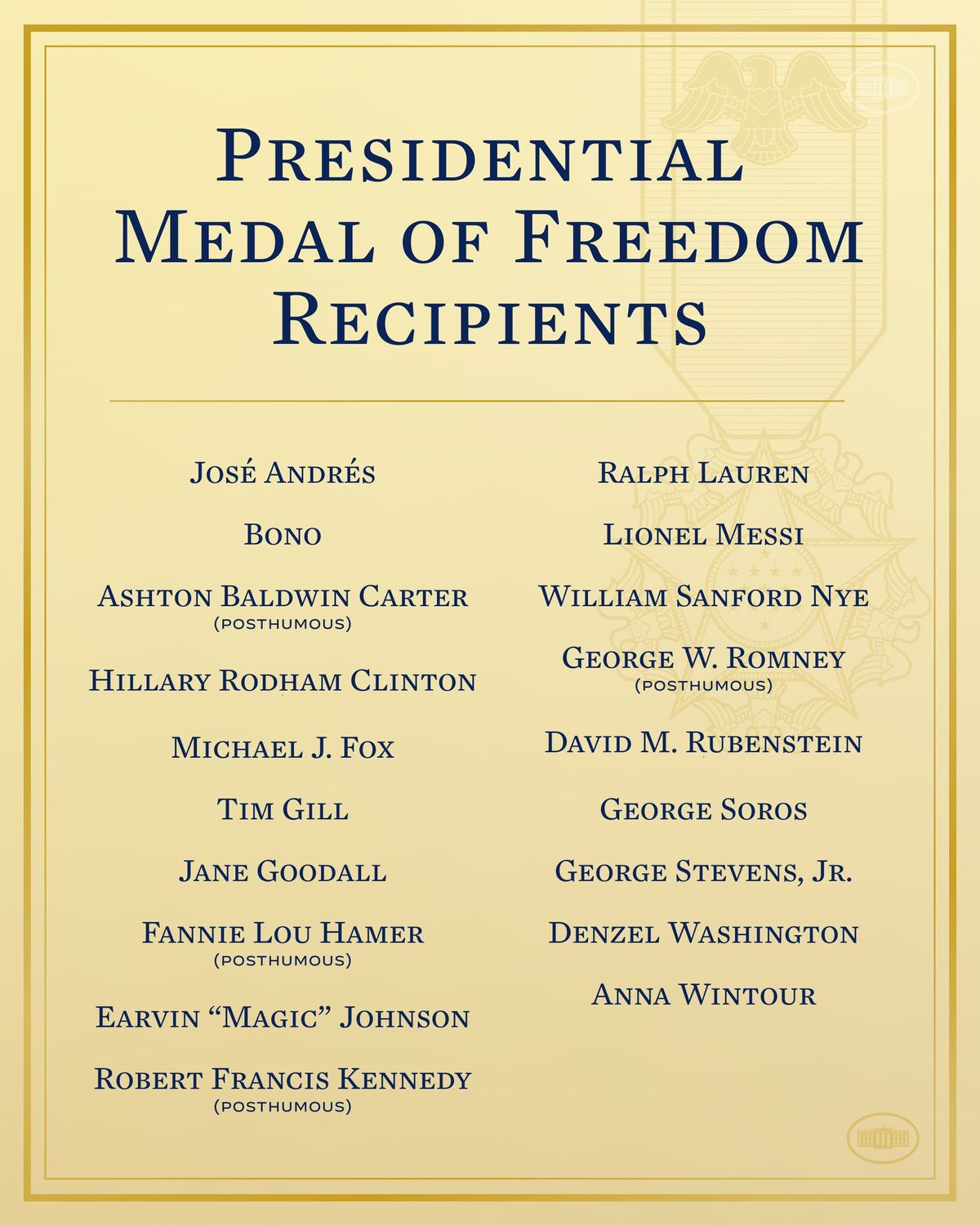 "La Medalla Presidencial de la Libertad se otorga a personas que han hecho contribuciones ejemplares a la prosperidad, los valores o la seguridad de los Estados Unidos, la paz mundial u otros esfuerzos sociales, públicos o privados significativos. Lionel Messi es el jugador más condecorado en la historia del fútbol profesional. Apoya programas de salud y educación para niños de todo el mundo a través de la Fundación Leo Messi y se desempeña como Embajador de Buena Voluntad de UNICEF" (el anuncio de Casa Blanca).