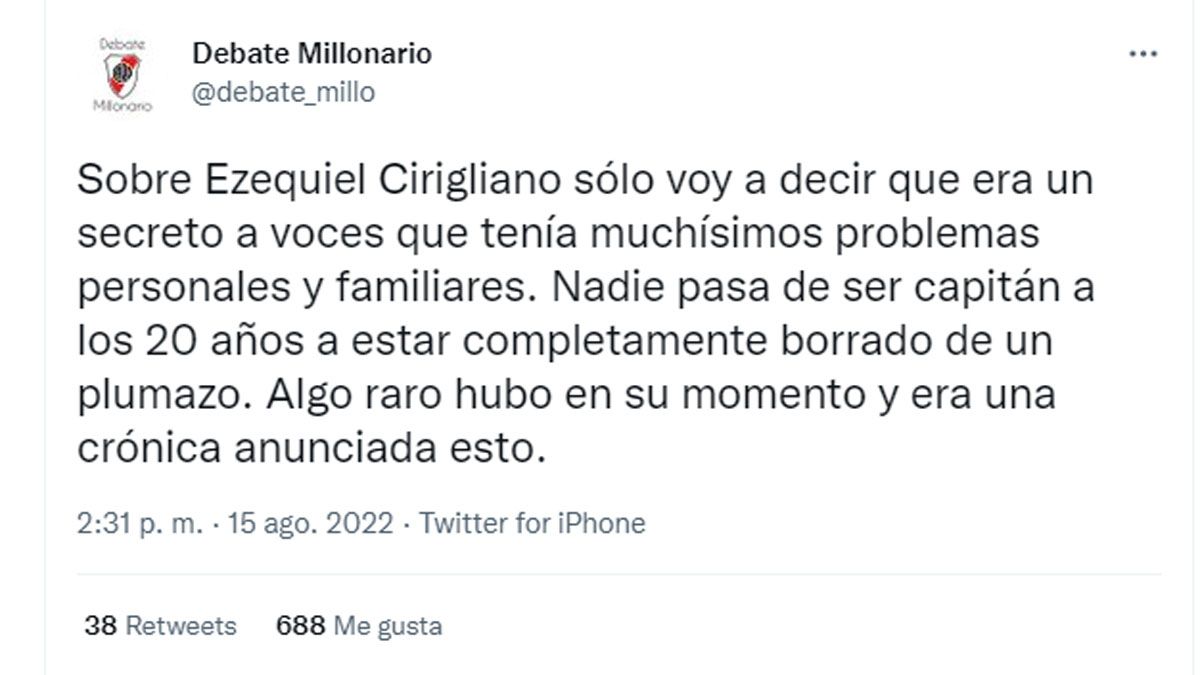Por su parte, Claudio, un primo de Cirigliano, ratificó que la depresión del ex mediocampista está ligada a su partida del club de Núñez: "El problema de él nace de un desarraigo del club que lo formó, que lo levantó y lo puso como capitán, como estrella, como figura a futuro y, de repente, las respuestas, los malos tratos, la no contención, hizo que él cayera en un pozo depresivo", dijo el familiar.