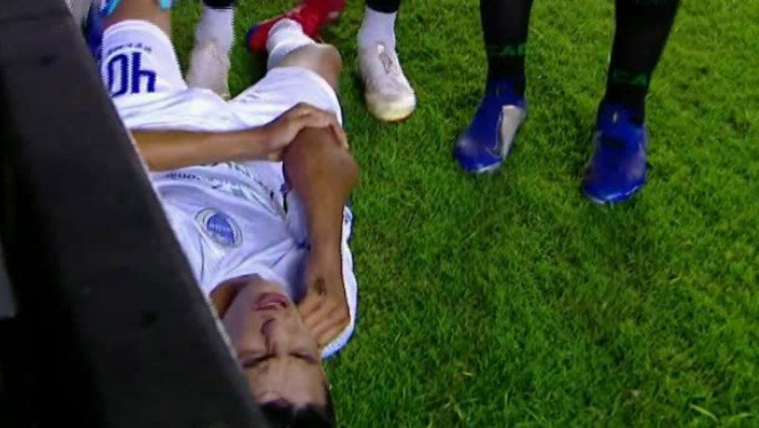Un golpe durísimo se dio el delantero de Godoy Cruz, Richard Prieto, en el partido ante Banfield, en el Florencio Sola.