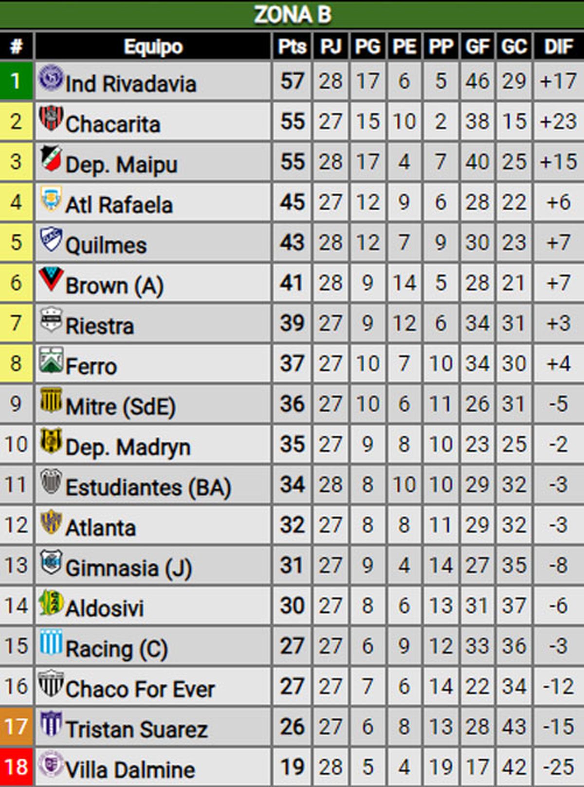 Luego de los partidos de este sábado de Independiente Rivadavia y Deportivo Maipú por la zona B, las posiciones quedaron al rojo vivo en la Primera Nacional