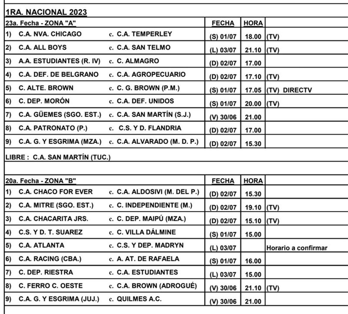 La siguiente es la programación prevista para los partidos de la fecha 23 de la zona A y la 20 de la zona B, que se jugará durante el primer fin de semana de julio.