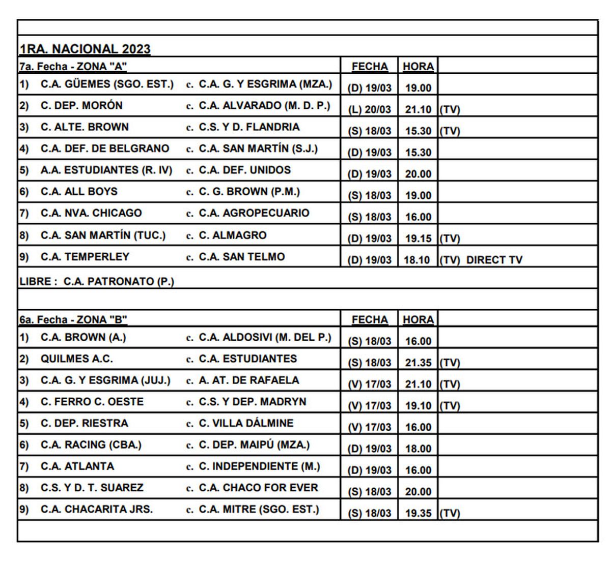 Los tres equipos actuarán el domingo 19 de marzo. Por la Zona A, Gimnasia y Esgrima visitará ese día a Güemes, a las 19, por la 7ª fecha.