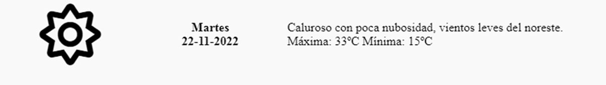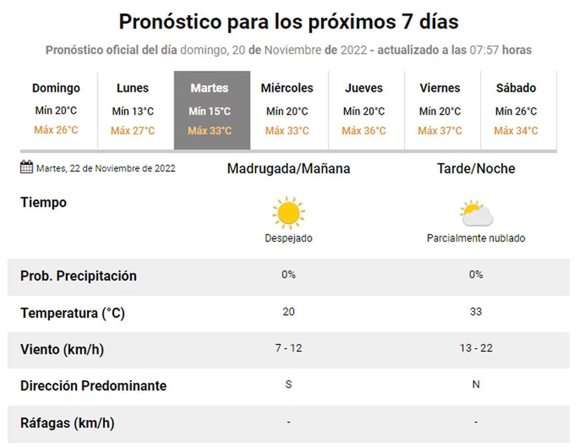 Según indica el Servicio Meteorológico Nacional, el martes 22 de noviembre tendrá un cielo despejado durante el día y nubosidad variable hacia la tarde, con una temperatura mínima de 20ºC y una máxima de 33ºC.