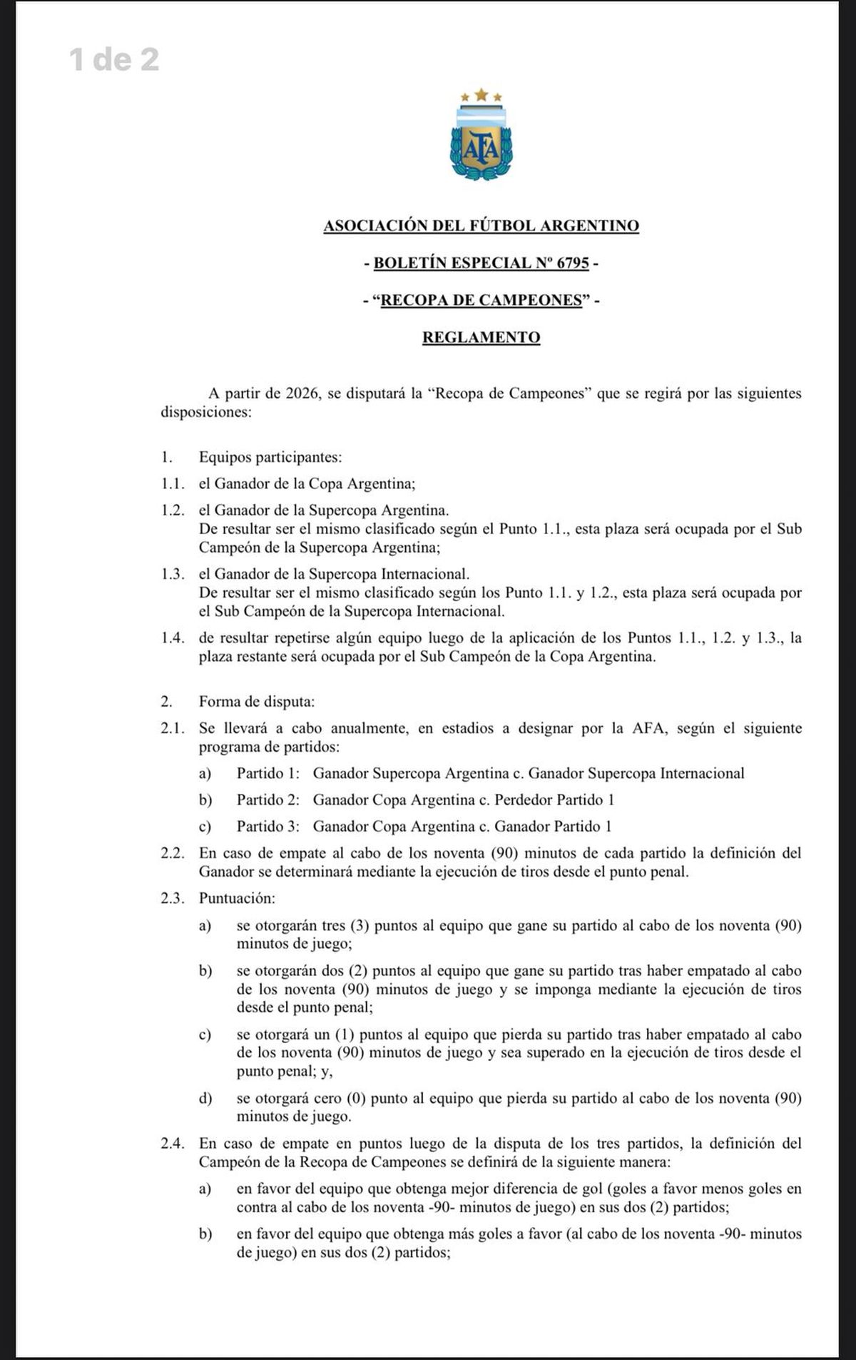 Una nueva competencia se instalará en el fútbol argentino a partir del 2026. La Recopa de Campeones fue anunciada por laAsociación del Fútbol Argentino y se trata de un nuevo certamen que reunirá a los clubes que sean campeones de los principales torneos nacionales.