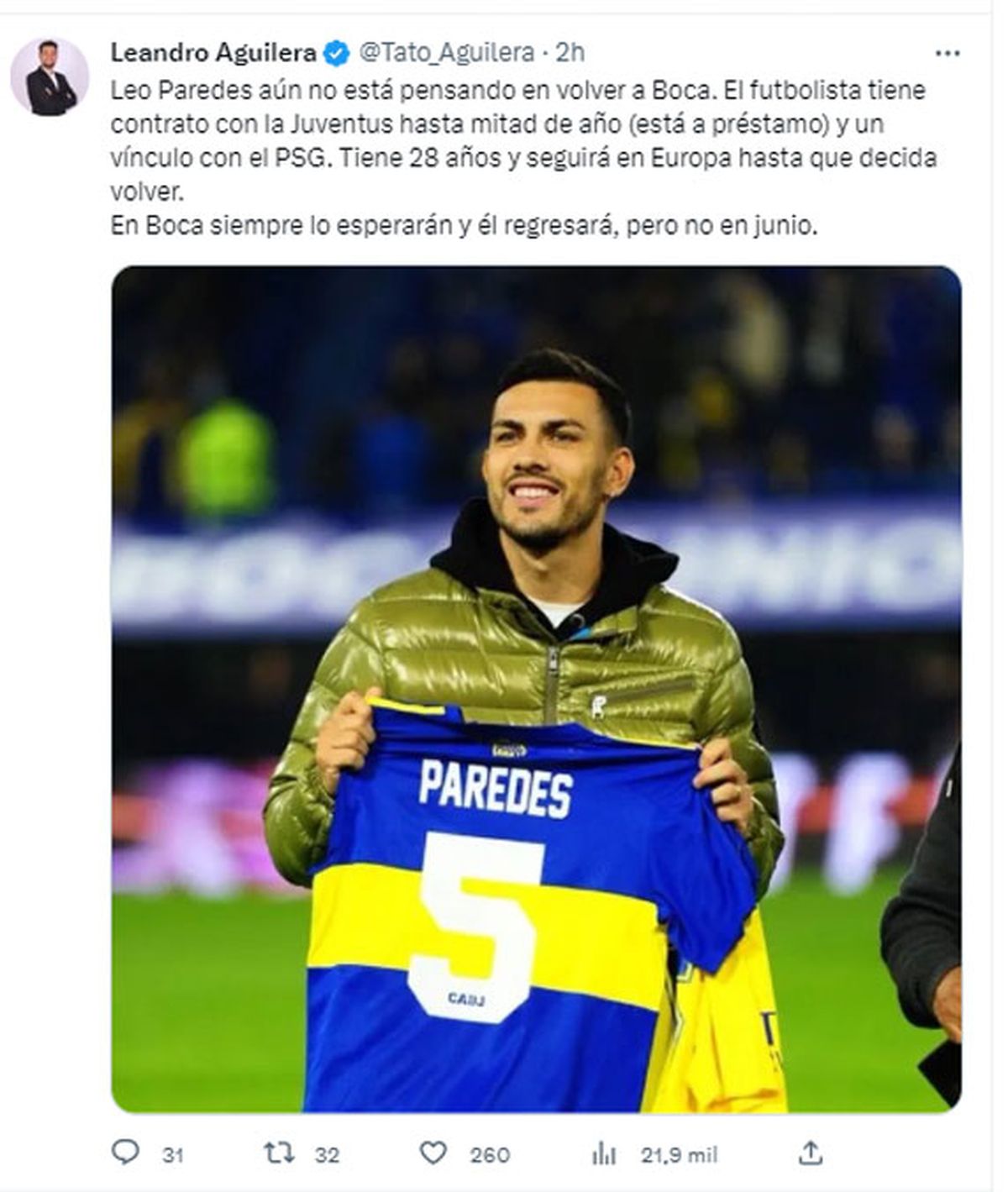 El periodista Leandro Tato Aguilera, que sigue la campaña de Boca, confirmó este miércoles por la mañana que Leandro Paredes no llegará a Boca en junio próximo, el club que lo vio nacer.