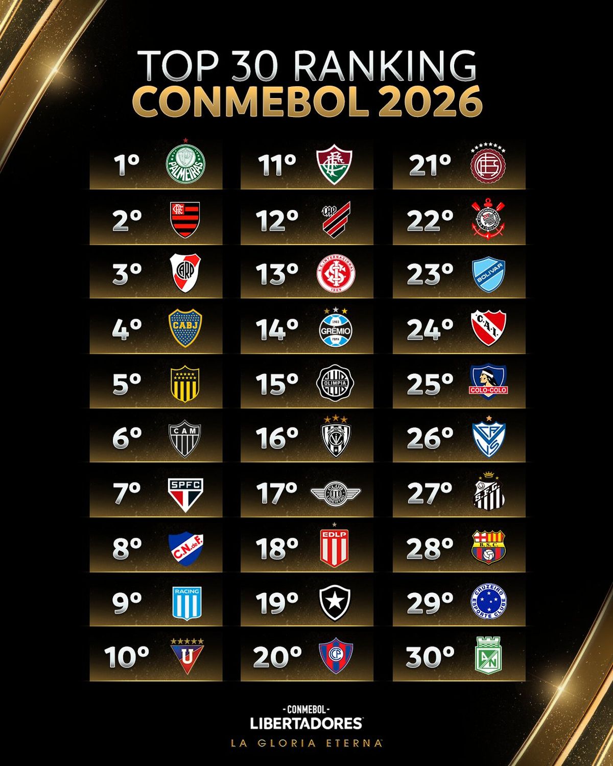Conmebol anunció el ranking de equipos para la temporada 2026, que incluye a River y Boca en el Top 10 y servirá para definir los bombos de la Copa Libertadores y Copa Sudamericana.