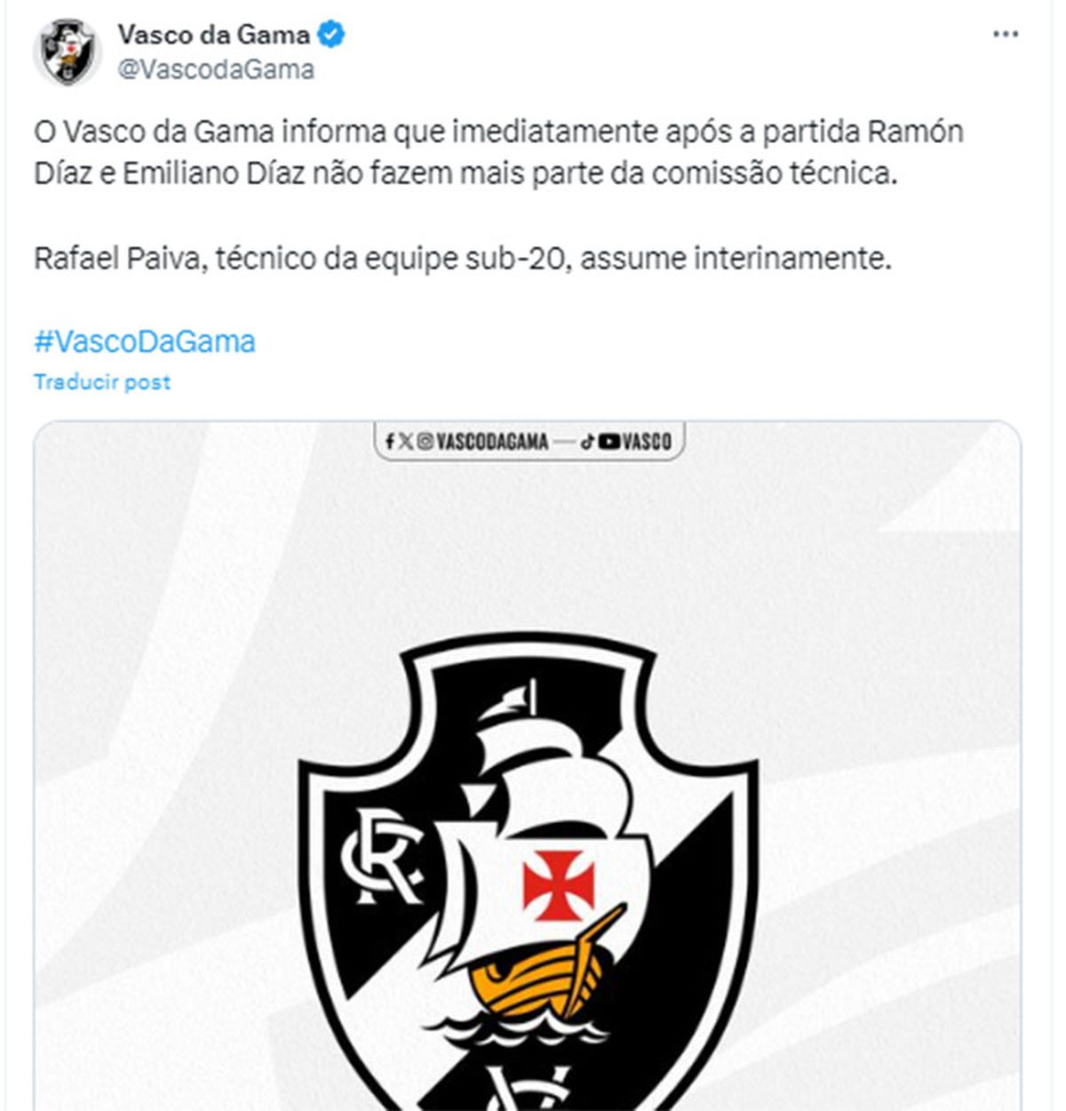 "Vasco da Gama informa que inmediatamente después del partido Ramón Díaz y Emiliano Díaz ya no forman parte del cuerpo técnico. Rafael Paiva, entrenador de la selección sub-20, asume de forma interina", comunicó el club a través de sus redes sociales.
