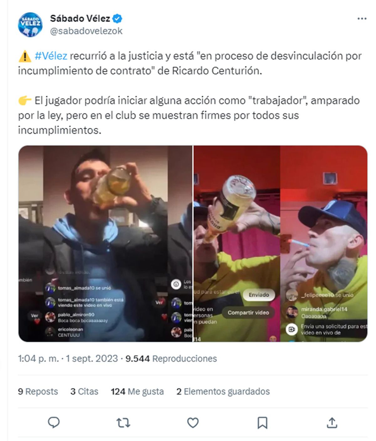 En la última semana, Centurión se volvió a mostrar en sus redes sociales manejando, fumando y bebiendo bebidas alcohólicas, y en Vélez se cansaron por sus conductas, por lo que piden cortar el vínculo.