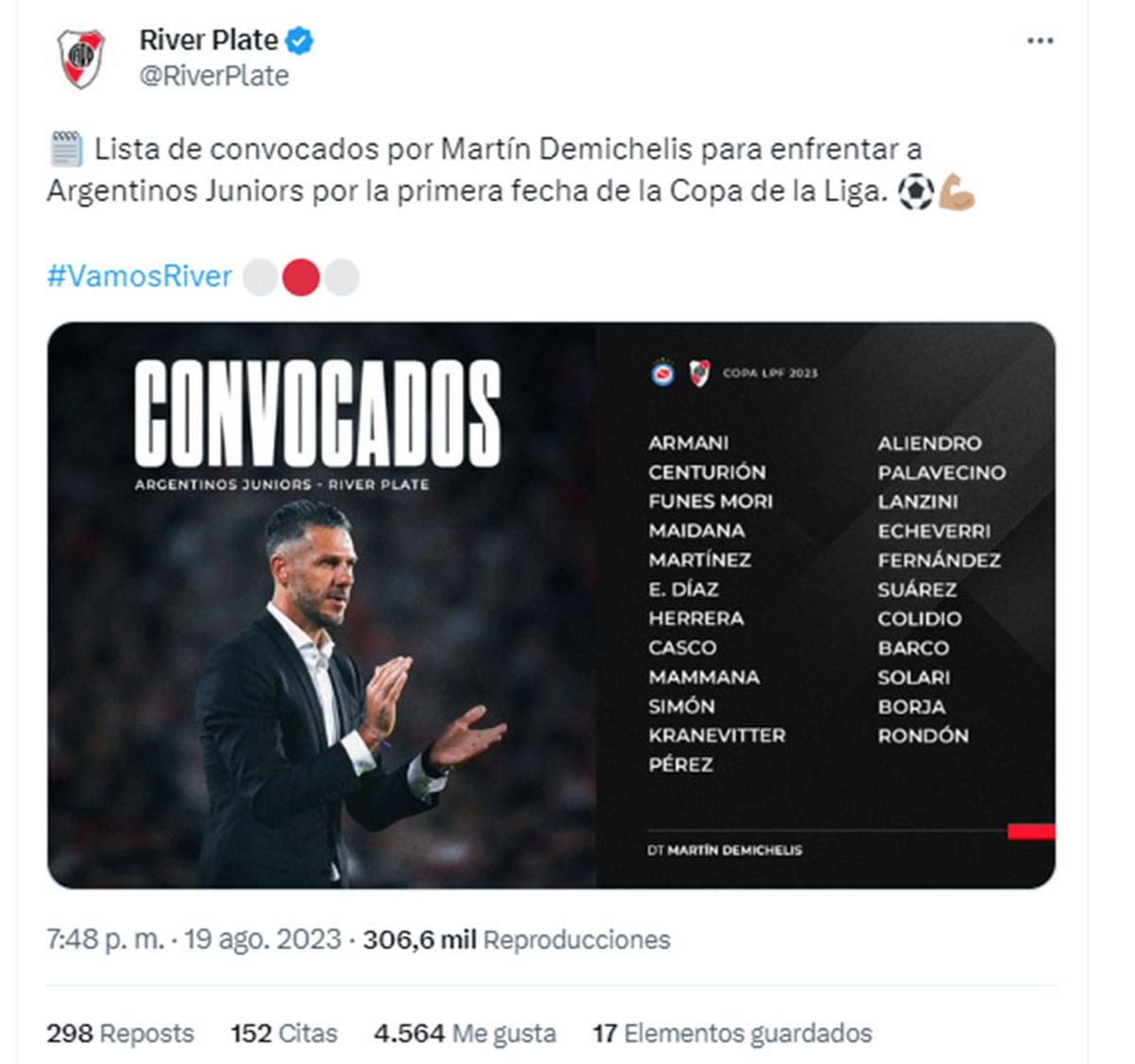 River Plate, campeón de la Liga Profesional 2023, jugará este domingo ante Argentinos Juniors, en La Paternal, en un partido válido por la fecha inicial de la Zona A de la Copa de la Liga profesional, su único objetivo en el semestre luego de haber quedado eliminado de la Copa Libertadores y de la Copa Argentina.