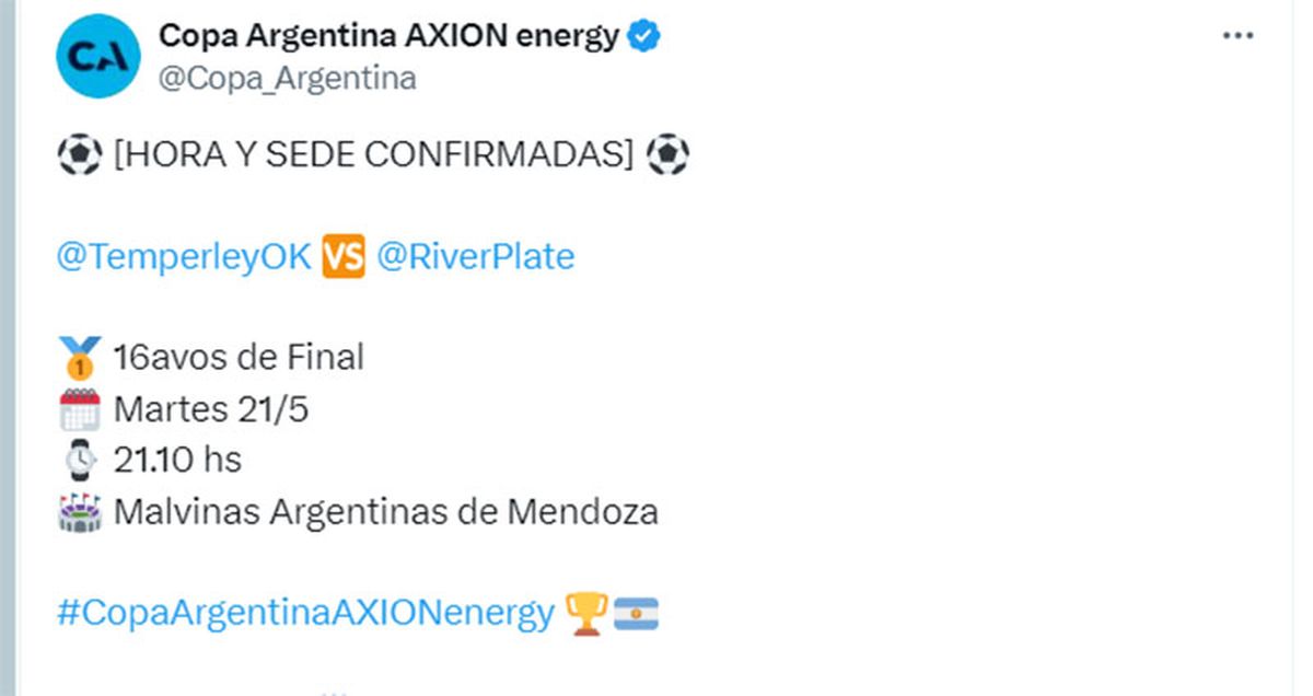 Así lo confirmó este jueves la cuenta oficial de X de la Copa Argentina.