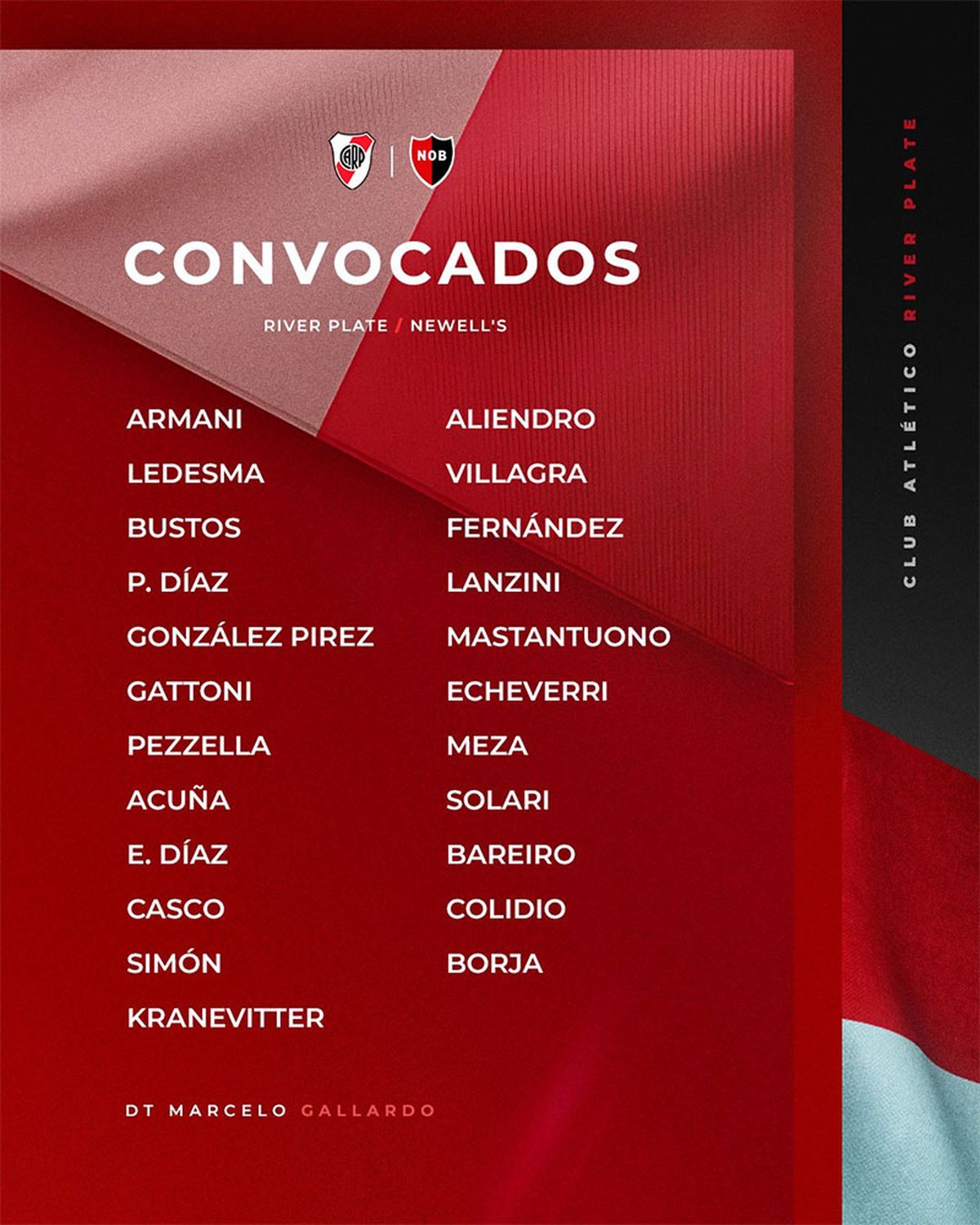 River: Franco Armani; Fabricio Bustos, Germán Pezzella, Paulo Díaz, Enzo Díaz; Rodrigo Aliendro, Matías Kranevitter; Santiago Simón, Franco Mastantuono o Claudio Echeverri, Maximiliano Meza; Miguel Ángel Borja. DT: Marcelo Gallardo.