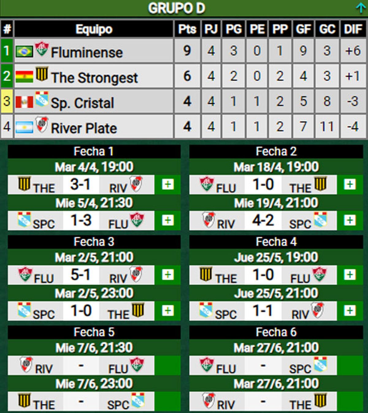 Fluminense, por su parte, lidera el Grupo D con 9 puntos (tres victorias y una caída).