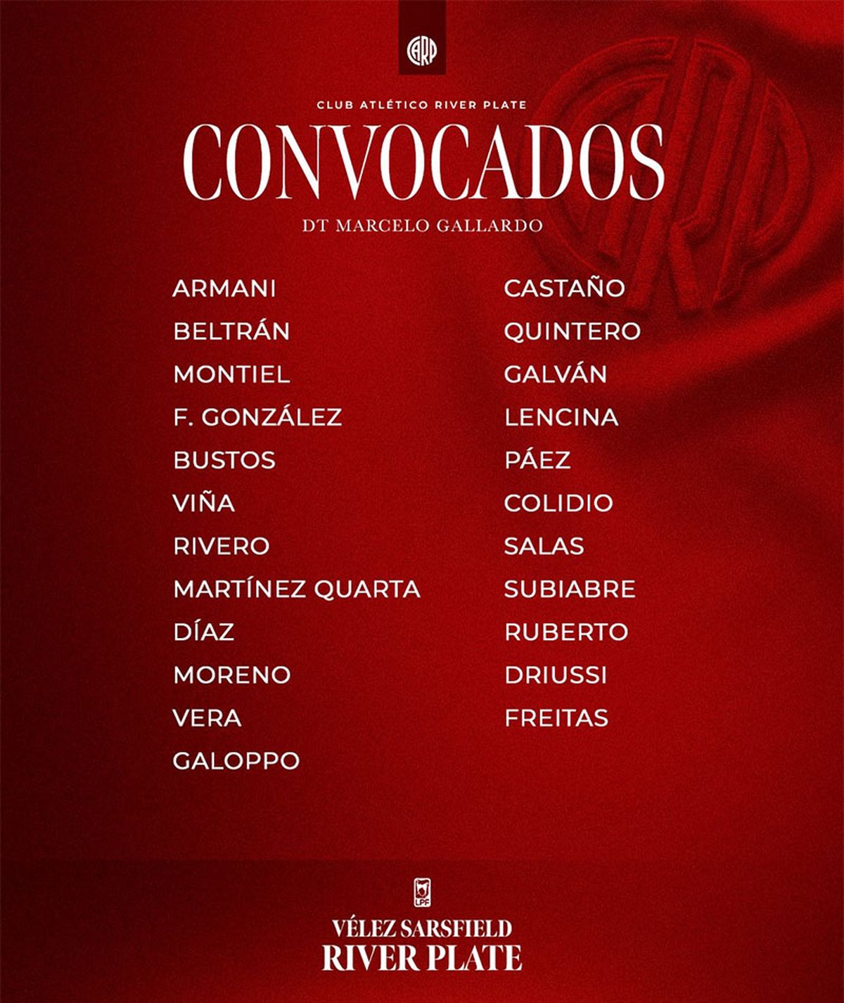 River: Franco Armani o Santiago Beltrán; Gonzalo Montiel, Lucas Martínez Quarta, Paulo Díaz o Lautaro Rivero, Matías Viña; Aníbal Moreno, Fausto Vera, Tomás Galván; Juan Fernando Quintero; Maximiliano Salas o Facundo colidio y Agustín Ruberto. DT: Marcelo Gallardo.