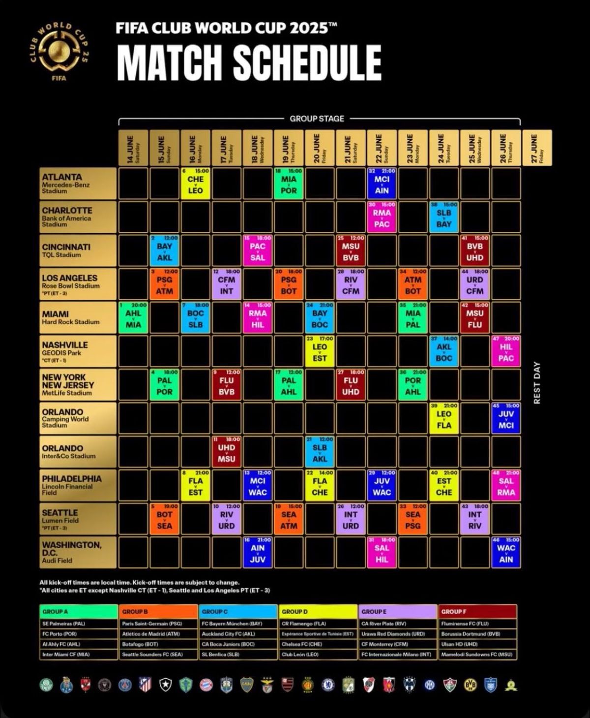 River debutará el martes 17 de junio ante Urawa Red Diamonds de Japón en Seattle (a las 17 de Argentina), luego jugará en el Rose Bowl de Los Angeles contra el Monterrey de México el sábado 21 de junio (a las 23 hora argentina) y cerrará el Grupo E contra el Inter de Italia el miércoles 25 de junio otra vez en Seattle (a las 23 de Argentina).