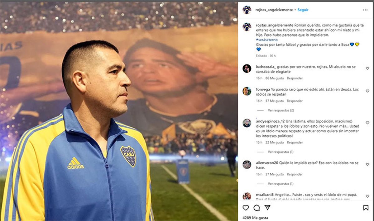 El histórico ex futbolista, quien ganó cinco títulos en el club, aseguró en su cuenta de Instagram: "Román, querido, cómo me gustaría que te enteres que me hubiera encantado estar ahí con mi nieto y mi hijo. Pero hubo personas que lo impidieron. Serás eterno. Gracias por tanto fútbol y gracias por darle tanto a Boca".