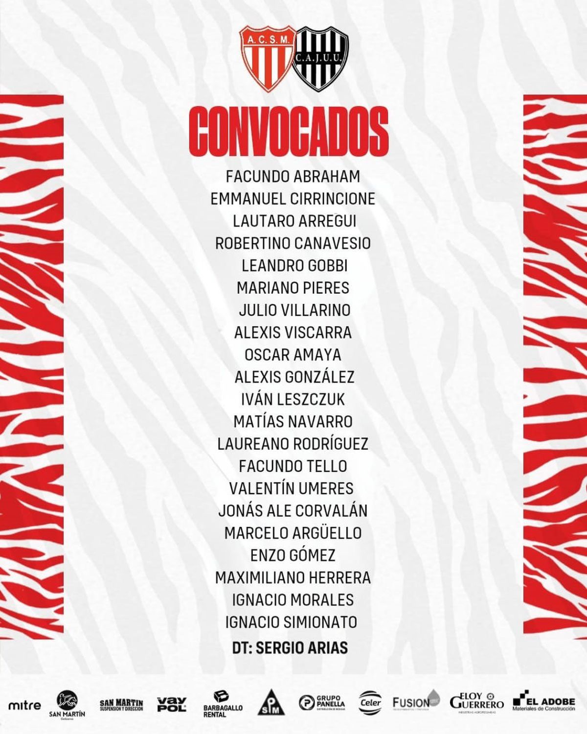 Atlético San Martín: Facundo Abraham; Alexis Viscarra, Mariano Pieres, Julio Villarino y Lautaro Arregui; Facundo Ezequiel Tello, Laureano Rodríguez, Jonás Corvalán e Iván Leszczuk; Ignacio Simionato y Marcelo Arguello. DT: Sergio Arias.