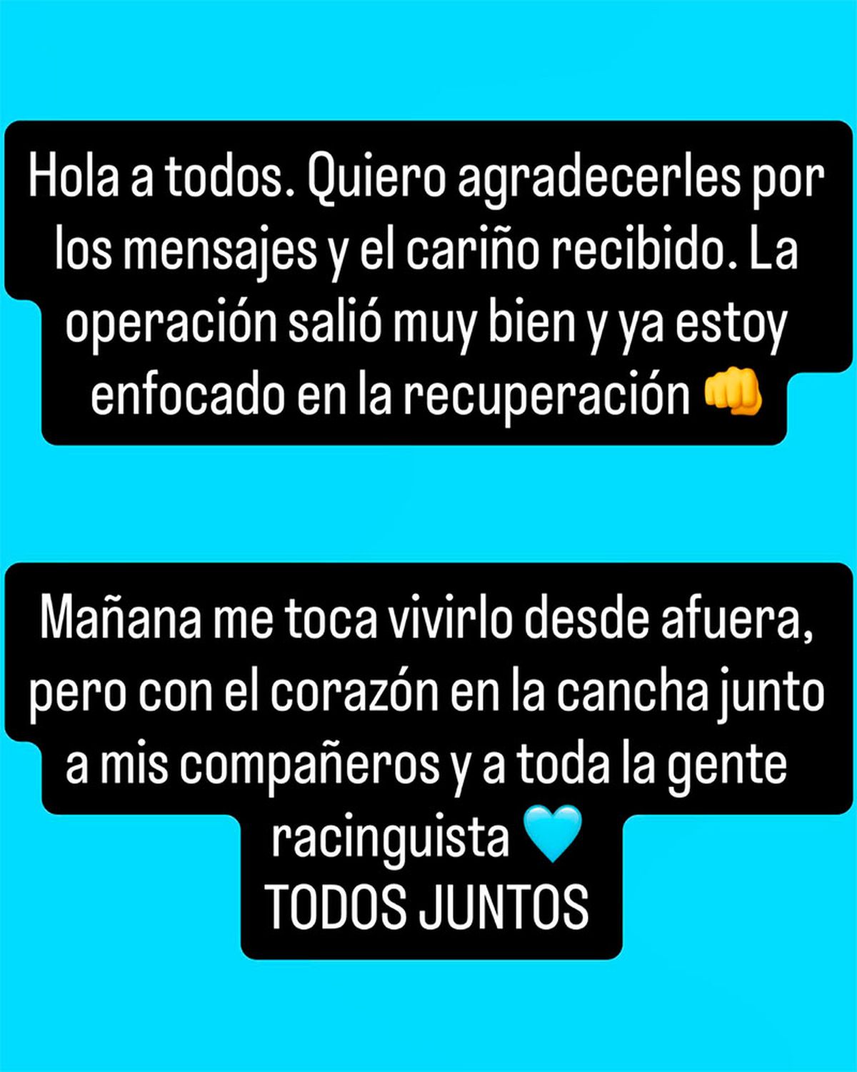 "Hola a todos. Quería agradecerles por los mensajes y el cariño recibido. La operación salió muy bien. Ya estoy enfocado en la recuperación. Mañana me toca vivirlo desde afuera, pero con el corazón adentro de la cancha junto a mis compañeros y la gente. Todos juntos", dijo Sosa, uno de los capitanes del equipo dirigido por Gustavo Costas.