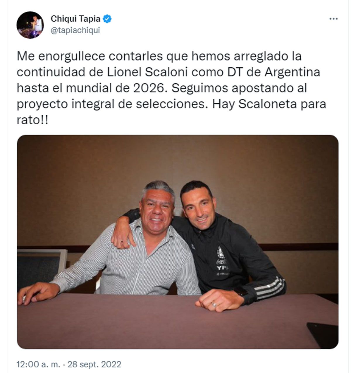 Ese anuncio lo realizó el propio Chiqui Tapia el pasado 28 de septiembre, en la previa del Mundial de Qatar, diciendo: "Hemos arreglado la continuidad de Lionel Scaloni hasta el Mundial de 2026. Hay Scaloneta para rato".