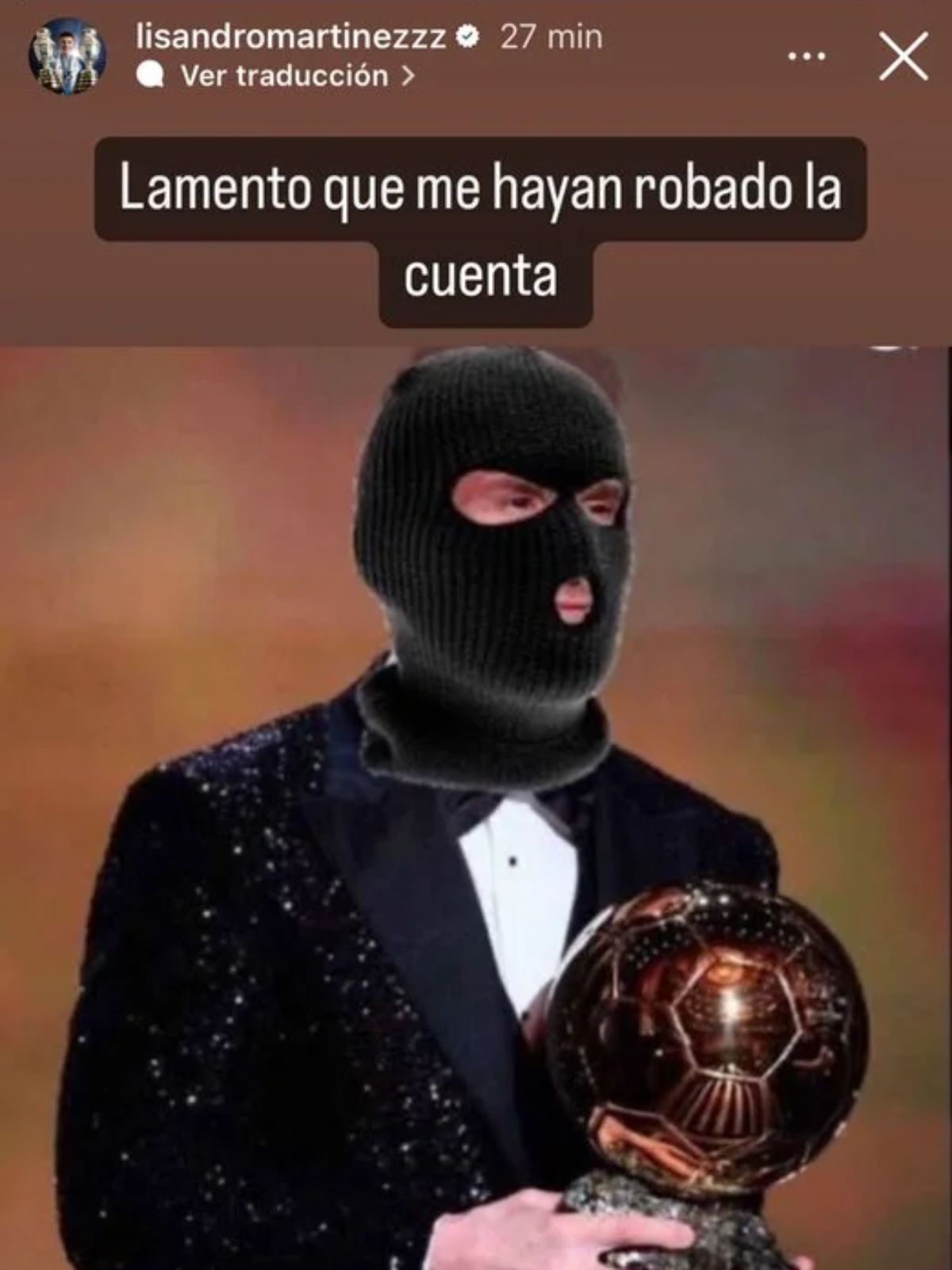"Lamento que me hayan robado la cuenta", fue la frase que apareció junto a la foto trucada de un Lionel Messi encapuchado en una historia del Instagram de Lisandro Martínez.