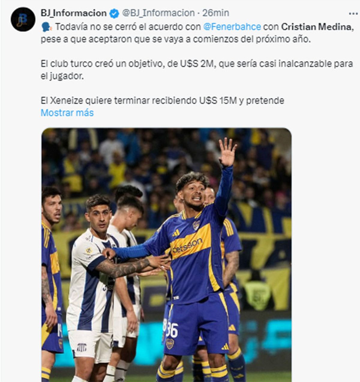 Los dos clubes llegaron a un principio de acuerdo por los 15 millones y que Medina emigre en el mes de enero de 2025, pero lo que traba la negociación, hasta el momento, es la cifra de dinero que desea Boca. Aun así, los dos clubes resaltaron que en algún momento se llegará a un acuerdo y el jugador va a pasar a pertenecer al conjunto turco.
