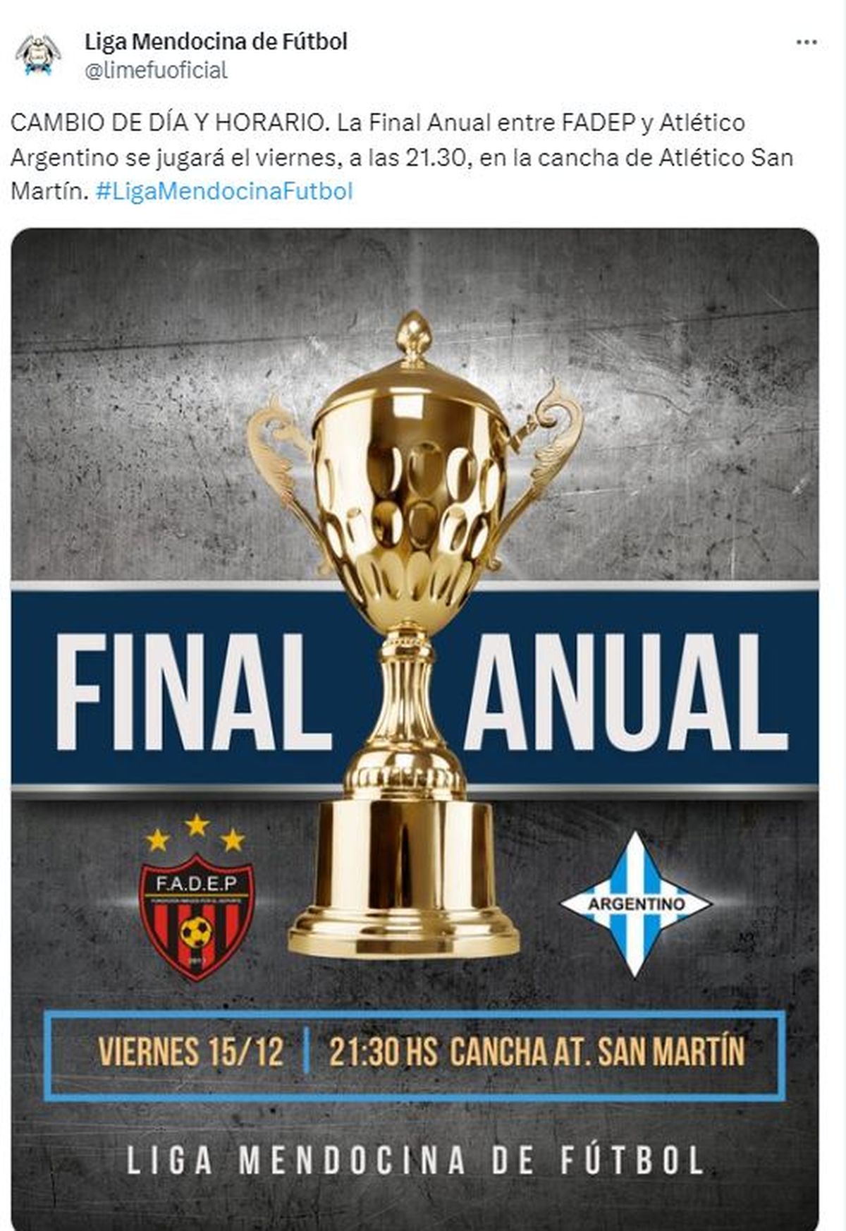 Atlético Argentino y FADEP protagonizarán este viernes la finalísima de la Liga Mendocina. El partido se jugará en el estadio del Atlético San Martín, desde las 21.30.