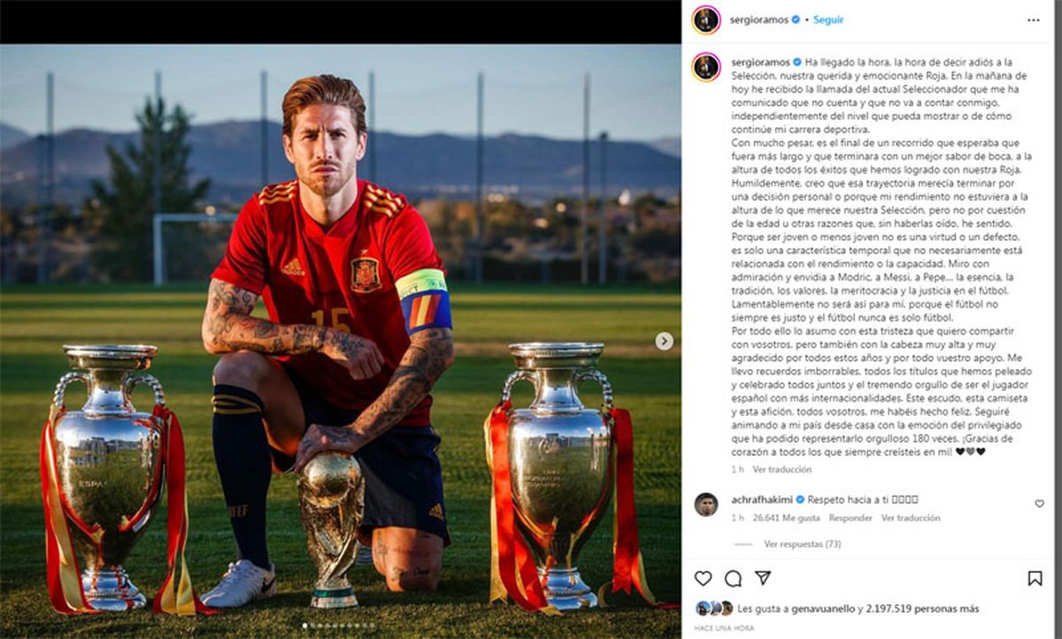 "Humildemente, creo que esa trayectoria merecía terminar por una decisión personal o porque mi rendimiento no estuviera a la altura de lo que merece nuestra Selección, pero no por cuestión de la edad u otras razones que, sin haberlas oído, he sentido. Porque ser joven o menos joven no es una virtud o un defecto, es solo una característica temporal que no necesariamente está relacionada con el rendimiento o la capacidad", señaló el defensor bicampeón de Europa.