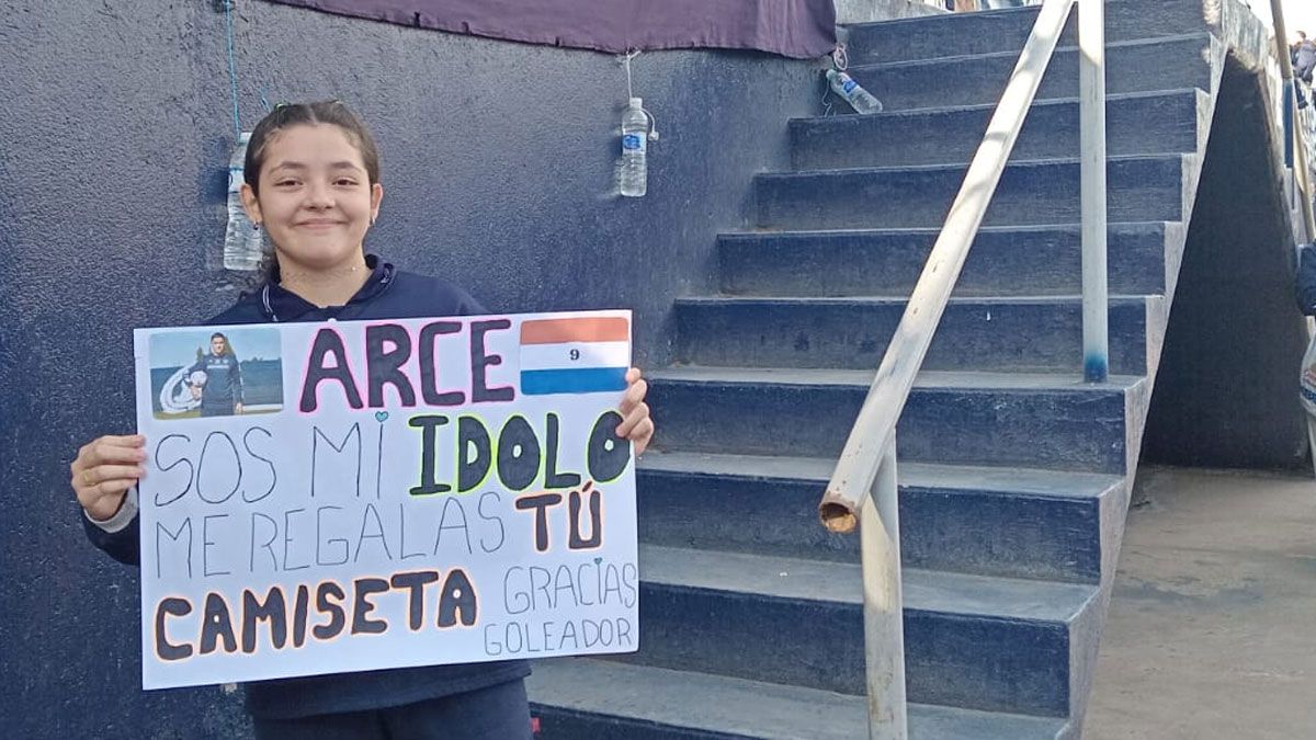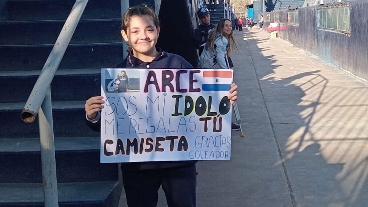 “Arce sos mi ídolo. Me regalas tu camiseta. Gracias goleador”, dice el cartel que genera mucha emoción.