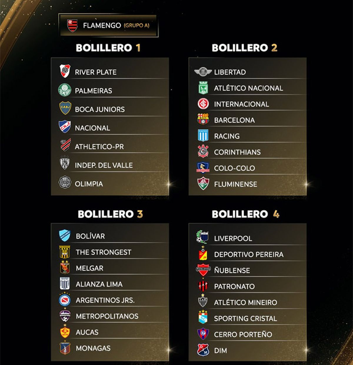 Por liderar el ranking Conmebol, River estará en el grupo B y luego se repartirán Palmeiras en el C, Boca en el D, Nacional de Uruguay en el E, Athletico Paranaense en el F, Independiente del Valle (campeón de la Sudamericana y de la Recopa) en el G y Olimpia, de Paraguay, en el H.