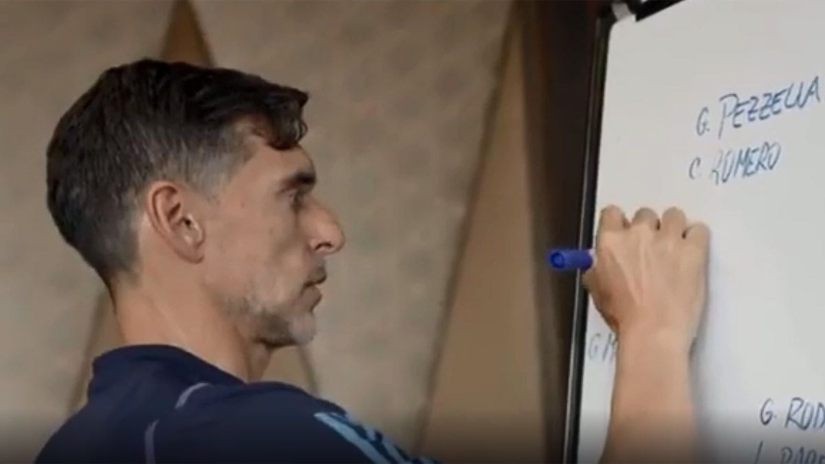 En las imágenes, Lionel Scaloni aparece junto a Roberto Ayala, uno de sus ayudantes, quien anota los nombres de los futbolistas en una pizarra según las indicaciones del director técnico.
