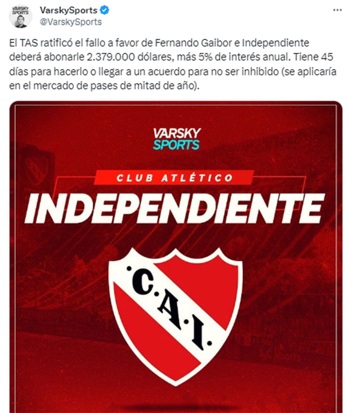 El Club Atlético Independiente recibió una mala noticia antes de su debut ante Independiente Rivadavia, por la Copa de la Liga, ya que el Tribunal de Arbitraje Deportivo (TAS) falló en favor del futbolista Fernando Gaibor por un reclamo salarial y deberá pagarle más de dos millones de dólares.