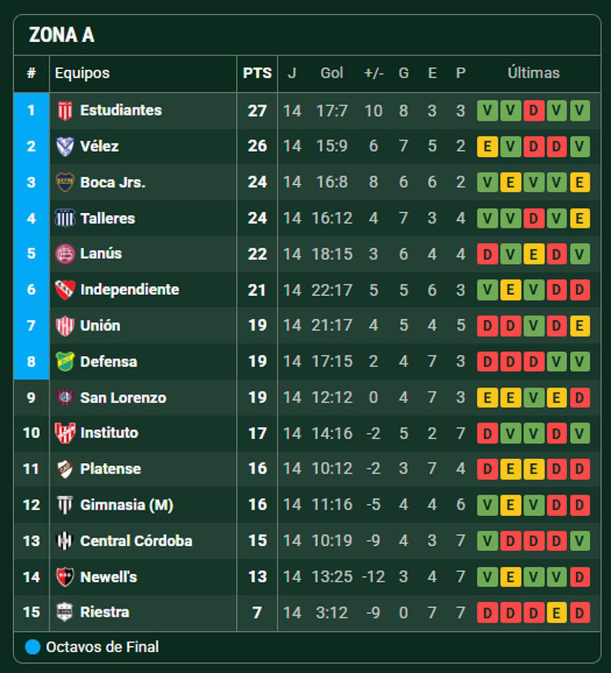 El Torneo Apertura tiene a sus cinco primeros equipos clasificados a la instancia de los playoffs. River e Independiente Rivadavia habían logrado su boleto en la jornada pasada, el sábado pasado se sumaron Estudiantes de La Plata y Argentinos Juniors y este lunes, en el cierre de la fecha 15, Vélez se aseguró su lugar en la próxima fase del certamen.