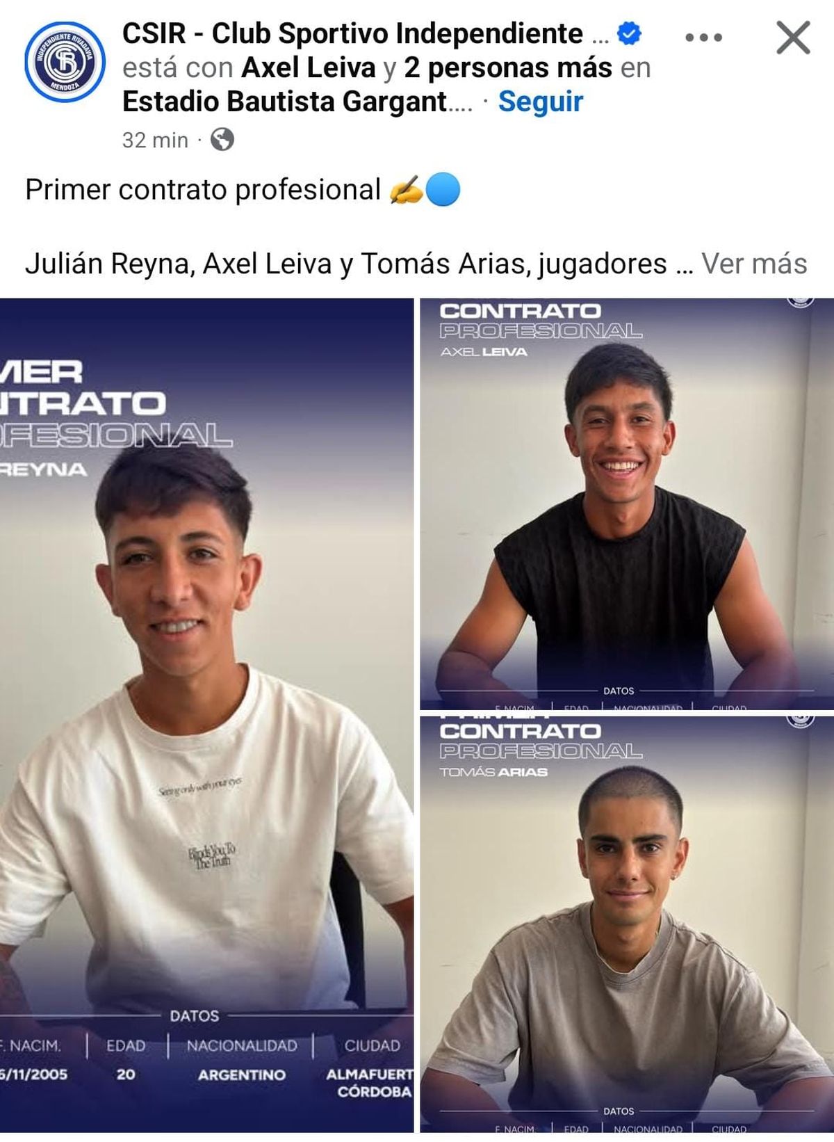 "Julián Reyna, Axel Leiva y Tomás Arias, jugadores de la Reserva, firmaron su primer contrato profesional con el Club Sportivo Independiente Rivadavia, con vínculo vigente hasta diciembre de 2027" fue el posteo que realizó el club en sus distintas redes sociales.
