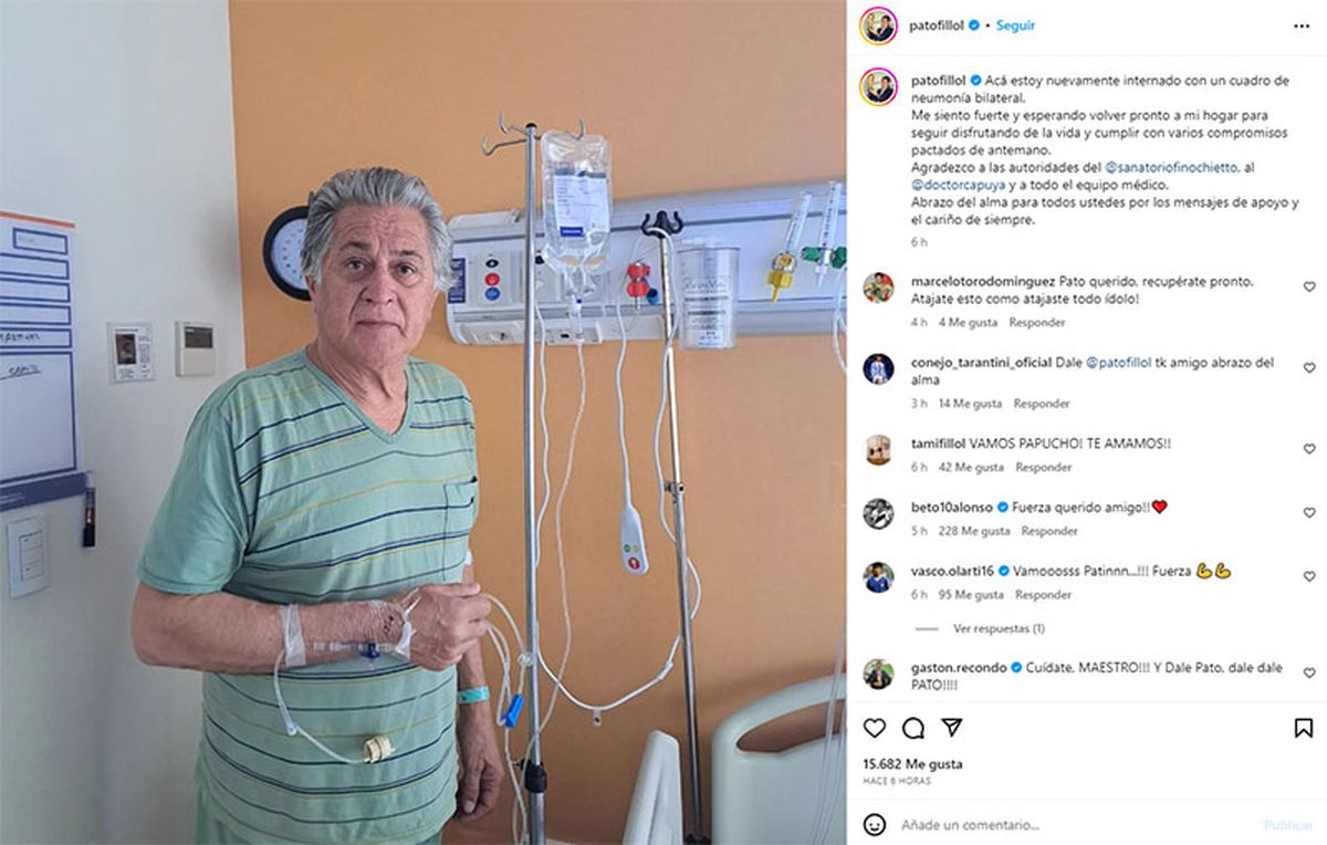 "Acá estoy nuevamente internado con un cuadro de neumonía bilateral. Me siento fuerte y esperando volver pronto a mi hogar para seguir disfrutando de la vida y cumplir con varios compromisos pactados de antemano. Agradezco a las autoridades del Sanatorio Finochietto, al doctor Capuya y a todo el equipo médico. Abrazo del alma para todos ustedes por los mensajes de apoyo y el cariño de siempre", dijo el Pato en Instagram.