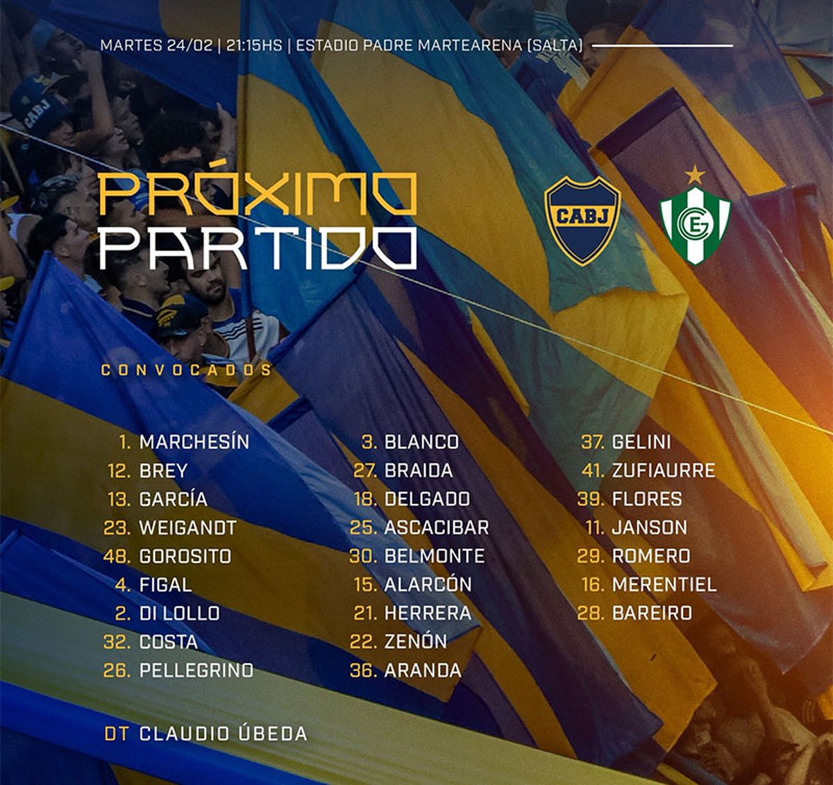 Leandro Brey; Marcelo Weigandt, Nicolás Figal, Marco Pellegrino, Malcom Braida; Tomás Belmonte, Milton Delgado, Williams Alarcón; Ángel Romero, Adam Bareiro y Lucas Janson.
