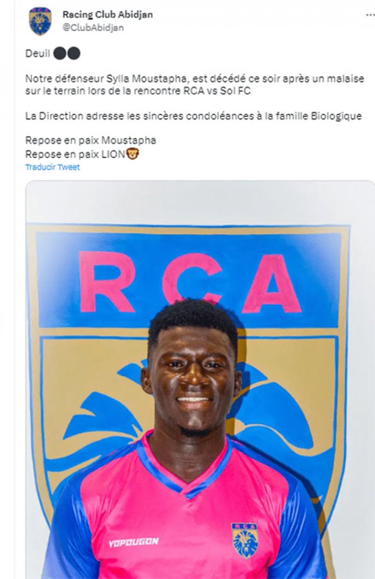 "Nuestro defensa Moustapha Sylla ha muerto esta noche después de un desmayo en el césped durante el partido entre el RCA (Racing de Abiyán) y el Sol FC”, señalaron.