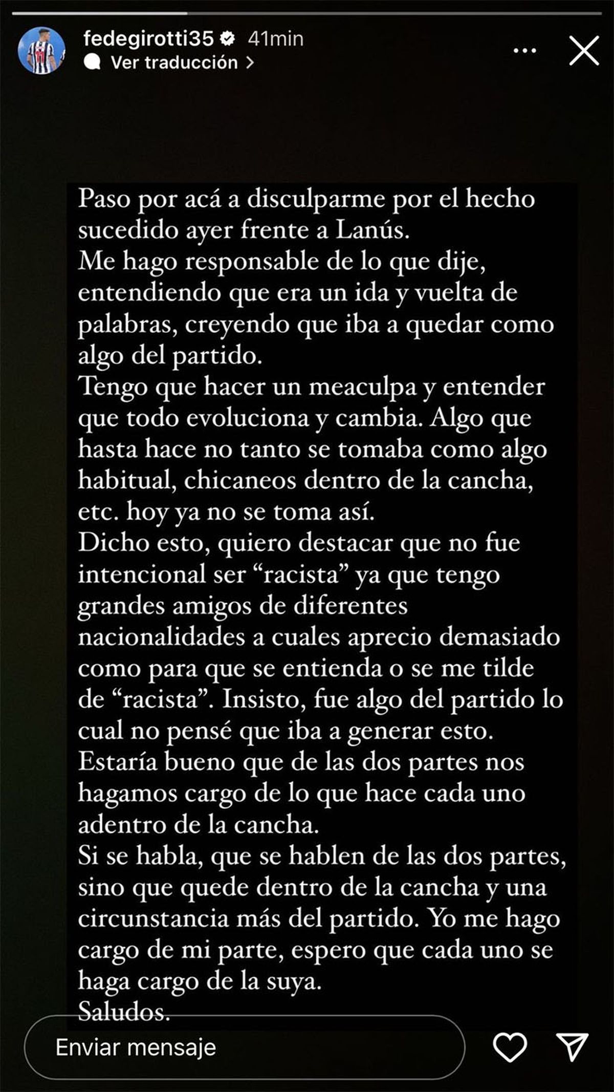 "Paso por acá a disculparme por el hecho sucedido ayer frente a Lanús. Me hago responsable de lo que dije, entendiendo que era un ida y vuelta de palabras, creyendo que iba a quedar como algo del partido", dijo Girotti en Instagram.