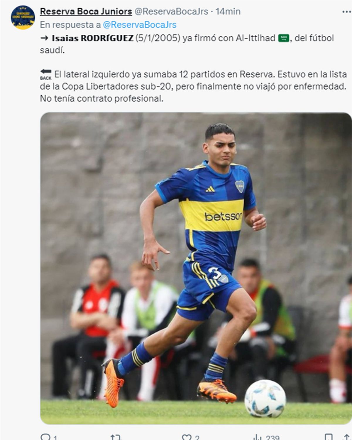 Boca le hizo un reclamo a la Federación Internacional de Fútbol Asociado (FIFA) por Isaías Rodríguez. Es que el juvenil que se desempeñaba en reserva no entrenó durante tres días seguidos, lo fueron a buscar a su casa y descubrieron que había firmado un contrato con Al Ittihad de Arabia Saudita.