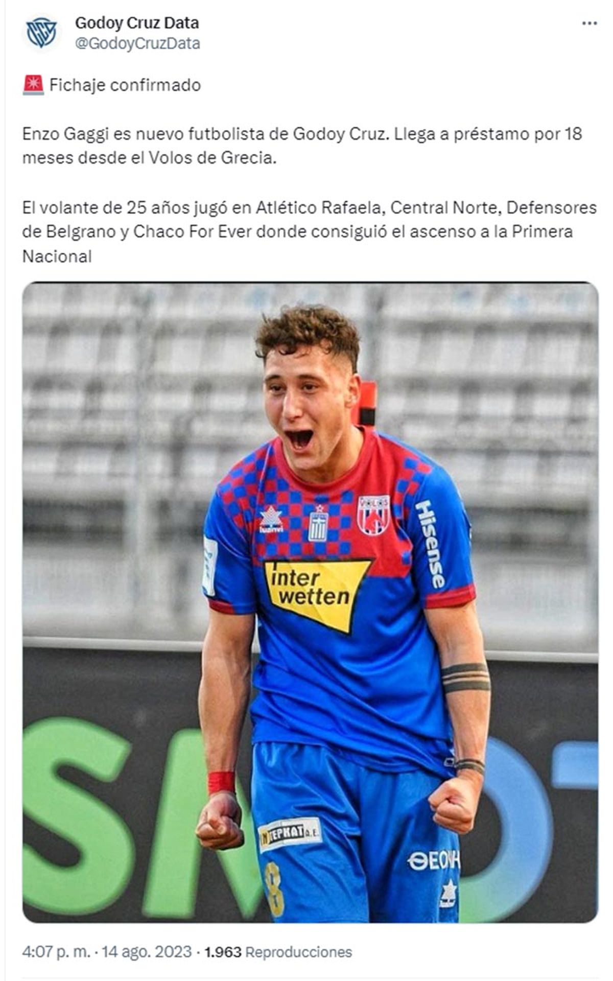 Enzo Gaggi, quien ya se realizó los exámenes médicos, se convirtió en nuevo jugador de Godoy Cruz. Arriba a préstamo por 18 meses y con opción de compra por el 70% el pase. Llega libre tras su paso por Volos de Grecia.