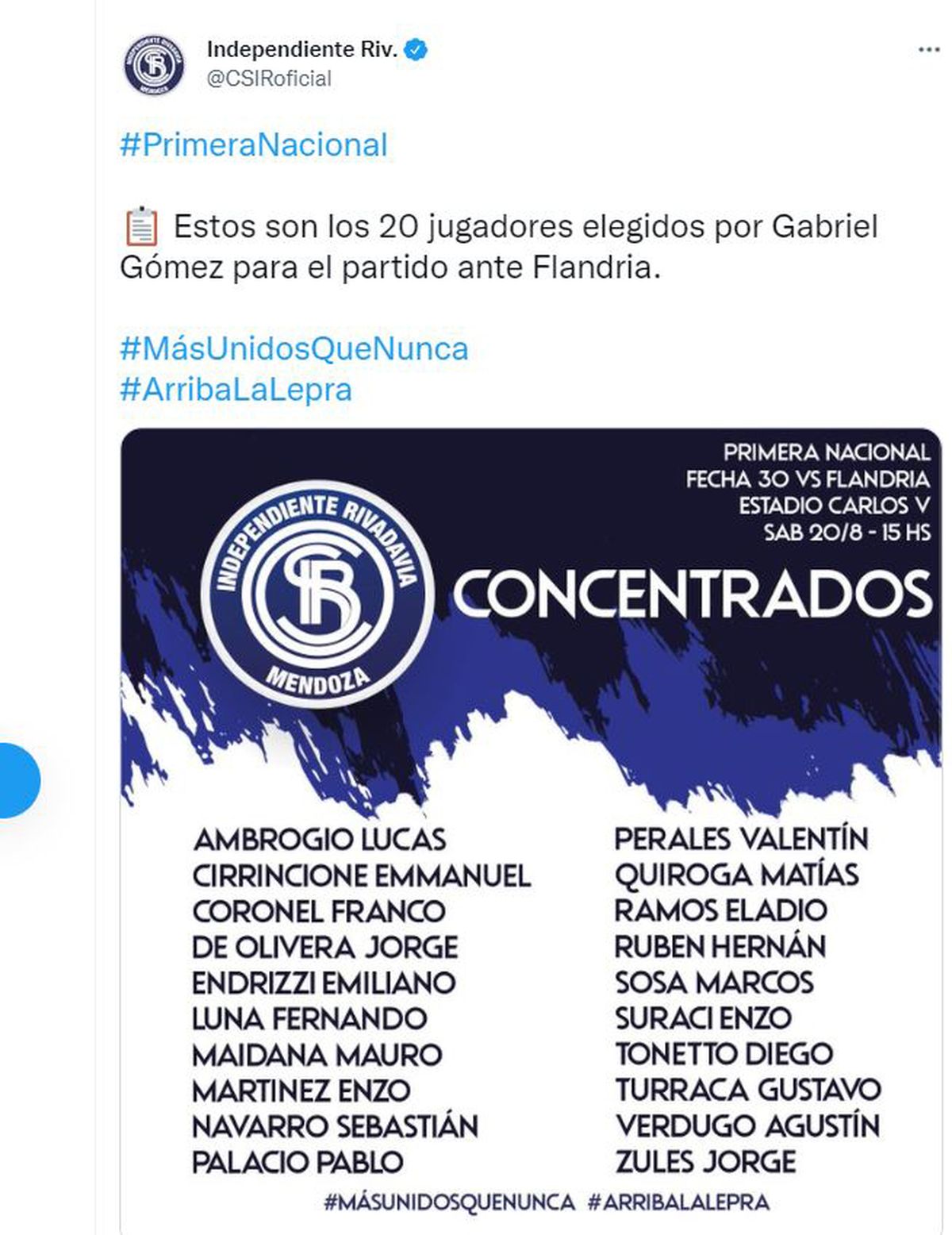 Los concentrados de Independiente Rivadavia para visitar a Flandria