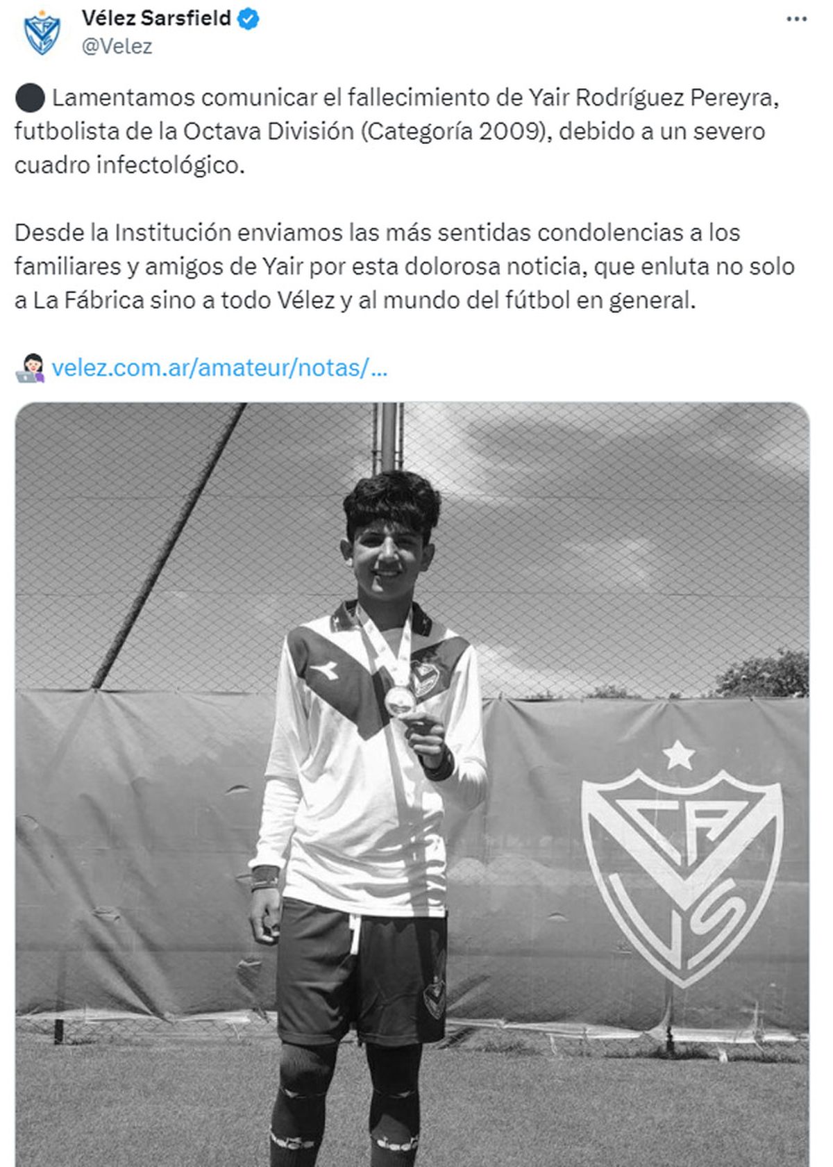 "Desde la Institución enviamos las más sentidas condolencias a los familiares y amigos de Yair por esta dolorosa noticia, que enluta no solo a La Fábrica sino a todo Vélez y el mundo del fútbol en general", añadió el comunicado de Vélez, que suspendió todas las actividades deportivas en la Villa Olímpica y en la sede.