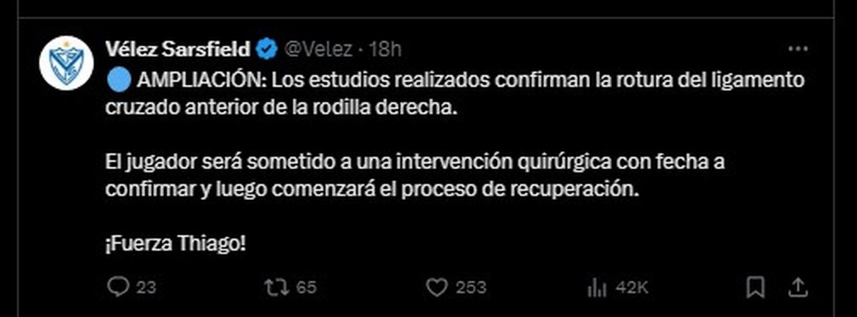Según el comunicado médico de Vélez, los exámenes indicaron que el joven futbolista tendrá una intervención quirúrgica (sin una fecha determinada), y luego de la operación se someterá al periodo de recuperación.