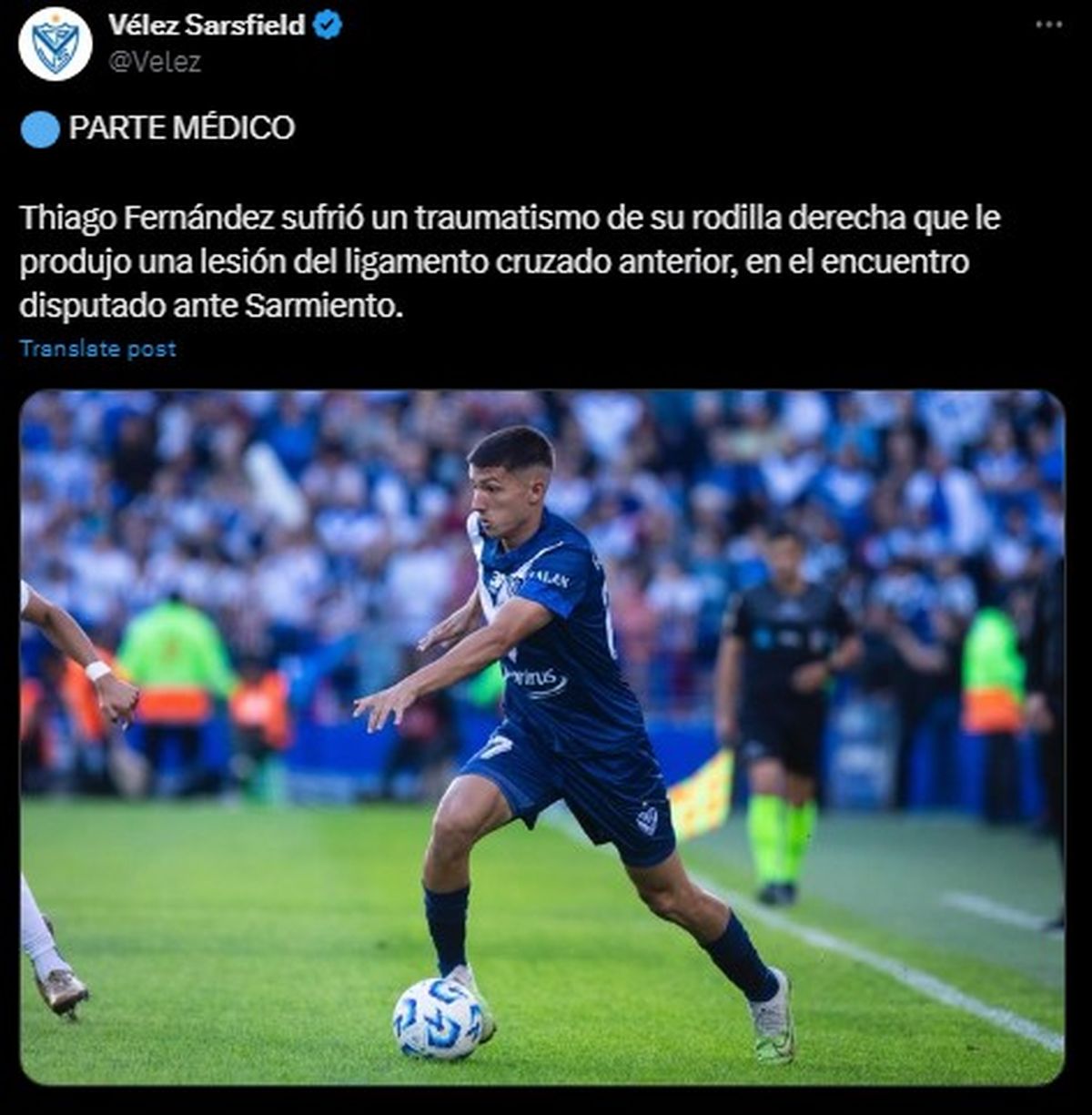 Vélez pierde a una de sus figuras más importantes de cara a la recta final del torneo. El delantero Thiago Fernández salió reemplazado por precaución el domingo en el encuentro ante Sarmiento, donde el Fortín derrotó al conjunto de Junín por 1-0, y luego el club confirmó que sufrió un traumatismo de su rodilla derecha producto de una lesión del ligamento cruzado anterior.