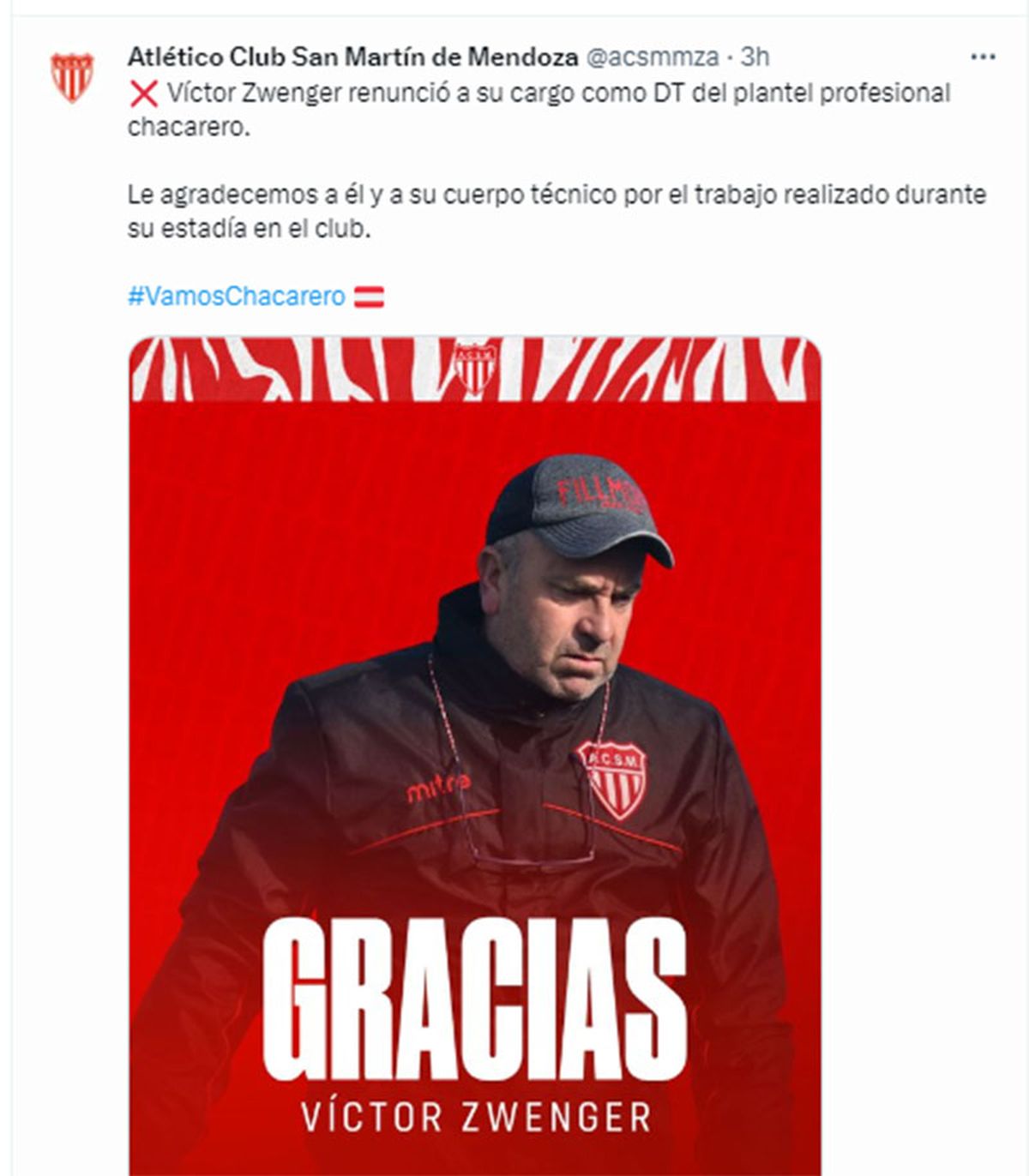 Víctor Zwenger no seguirá como técnico de San Martín en el torneo Federal A. Así lo confirmó este lunes el club albirrojo.
