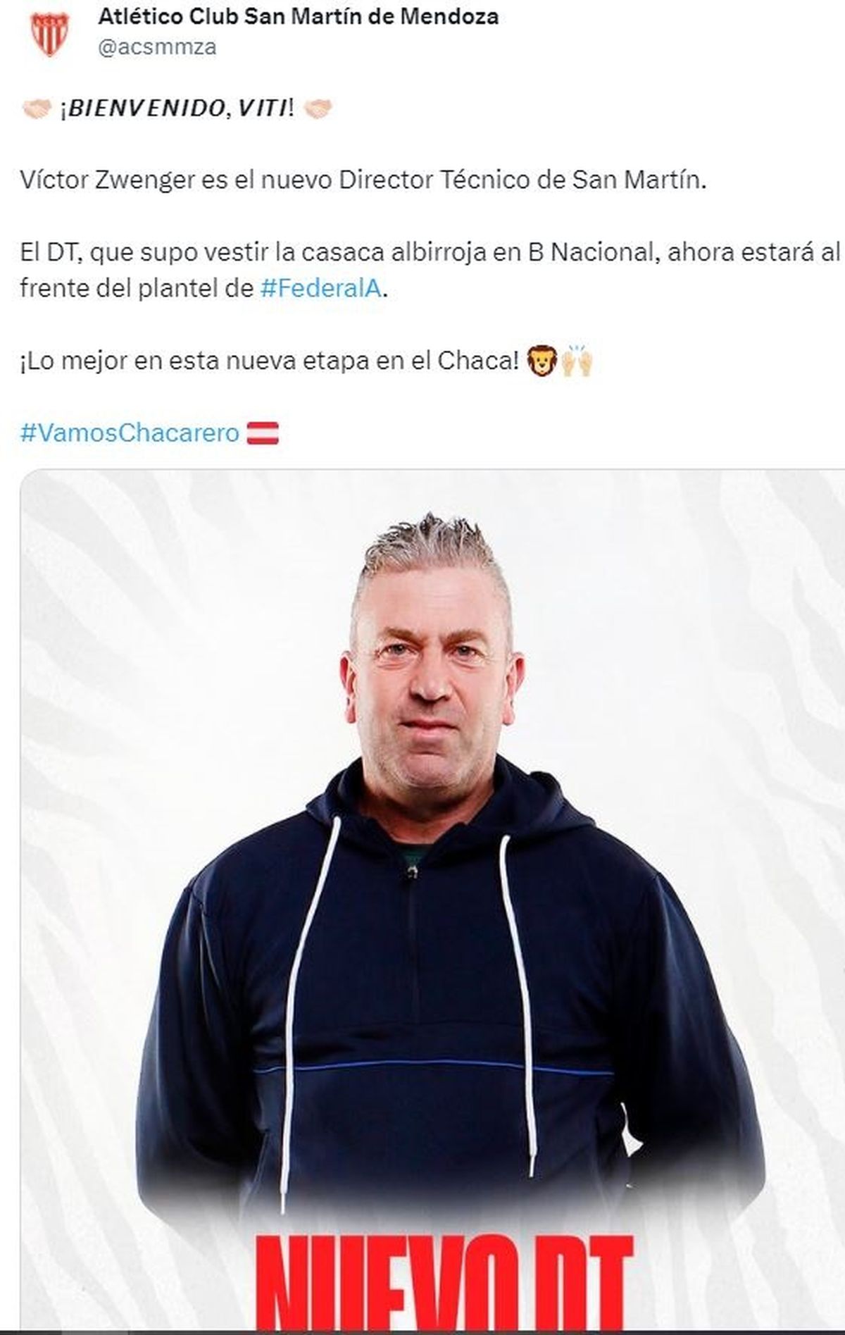 Víctor Zwenger es el nuevo entrenador del Atlético San Martín. El ex defensor, que estuvo en el club desde el 2001 al 2003, fue confirmado como el nuevo DT para el torneo Federal A, este miércoles fue presentado al plantel y dirigió su primera práctica.