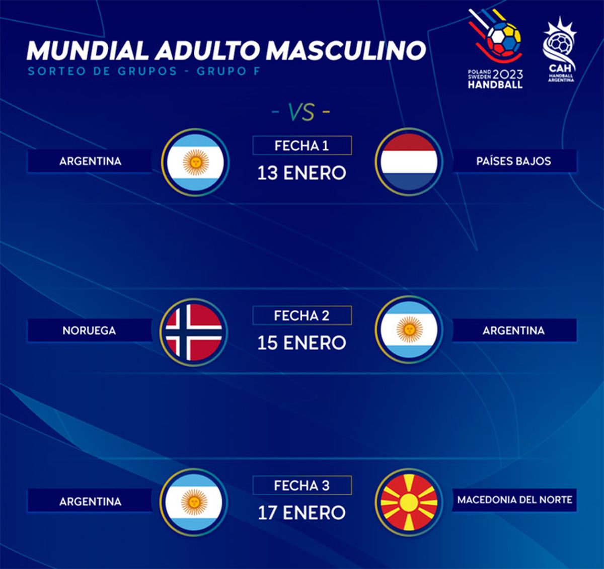 En julio pasado, la International Handball Federation realizó el sorteo de los grupos, donde la Selección argentina quedó enclavada en el Grupo F, junto a Noruega, Macedonia y Países Bajos.
