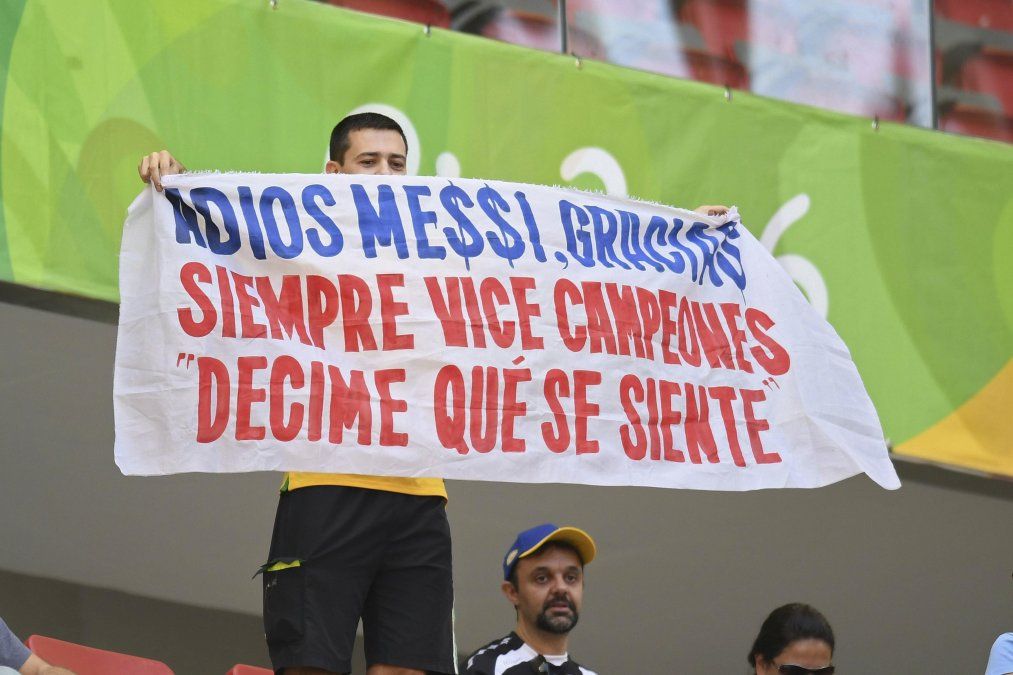 En el estadio Mane Garrincha donde Argentina empató con Honduras y se quedó fuera de los Juegos, los hinchas locales, que alientan a todo aquel que juegue contra la Albiceleste, mostraron una bandera burlándose de la renuncia de Messi y de las derrotas ante los chilenos con el típico "Decime qué se siente", con el que nosotros los cargábamos a ellos.
