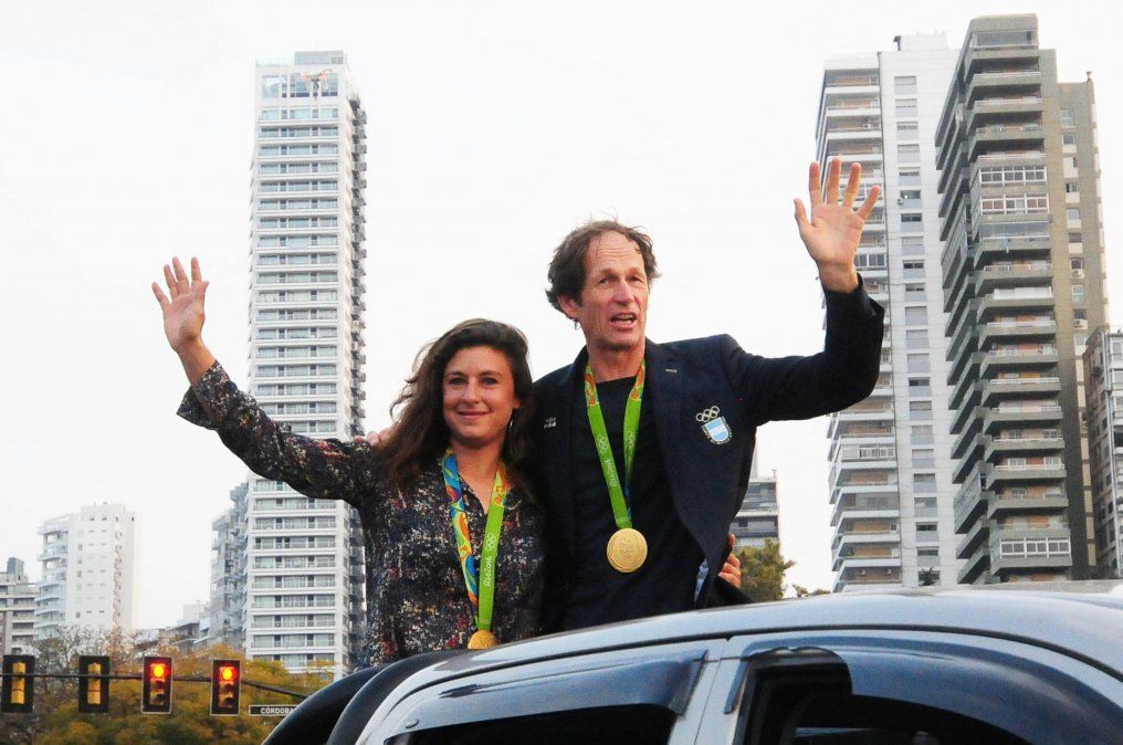 Los regatistas Cecilia Carranza y Santiago Lange, ganadores de una medalla de oro en los Juegos Olímpicos de Río de Janeiro, encabezaron una caravana por el centro de Rosario que concluyó en el Monumento a la Bandera, en la que recibieron el saludo y la admiración de sus seguidores y amigos.