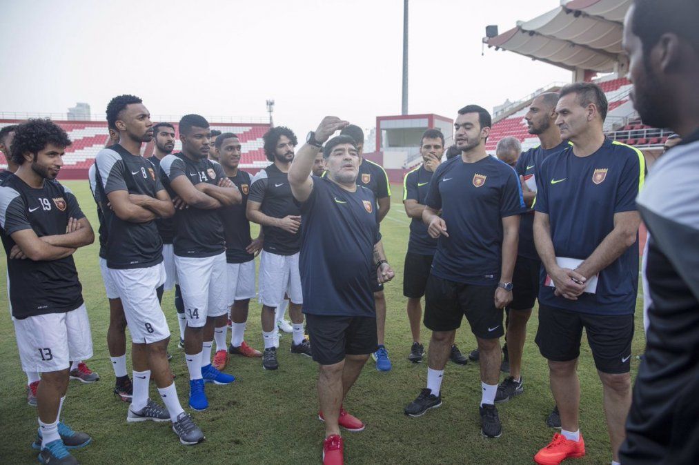 Diego Armando Maradona dirigió su primera práctica como técnico del Al Fujairah, club con el que firmó un acuerdo por una temporada y con el que tendrá el objetivo de subir a la máxima categoría del fútbol de Emiratos Árabes.