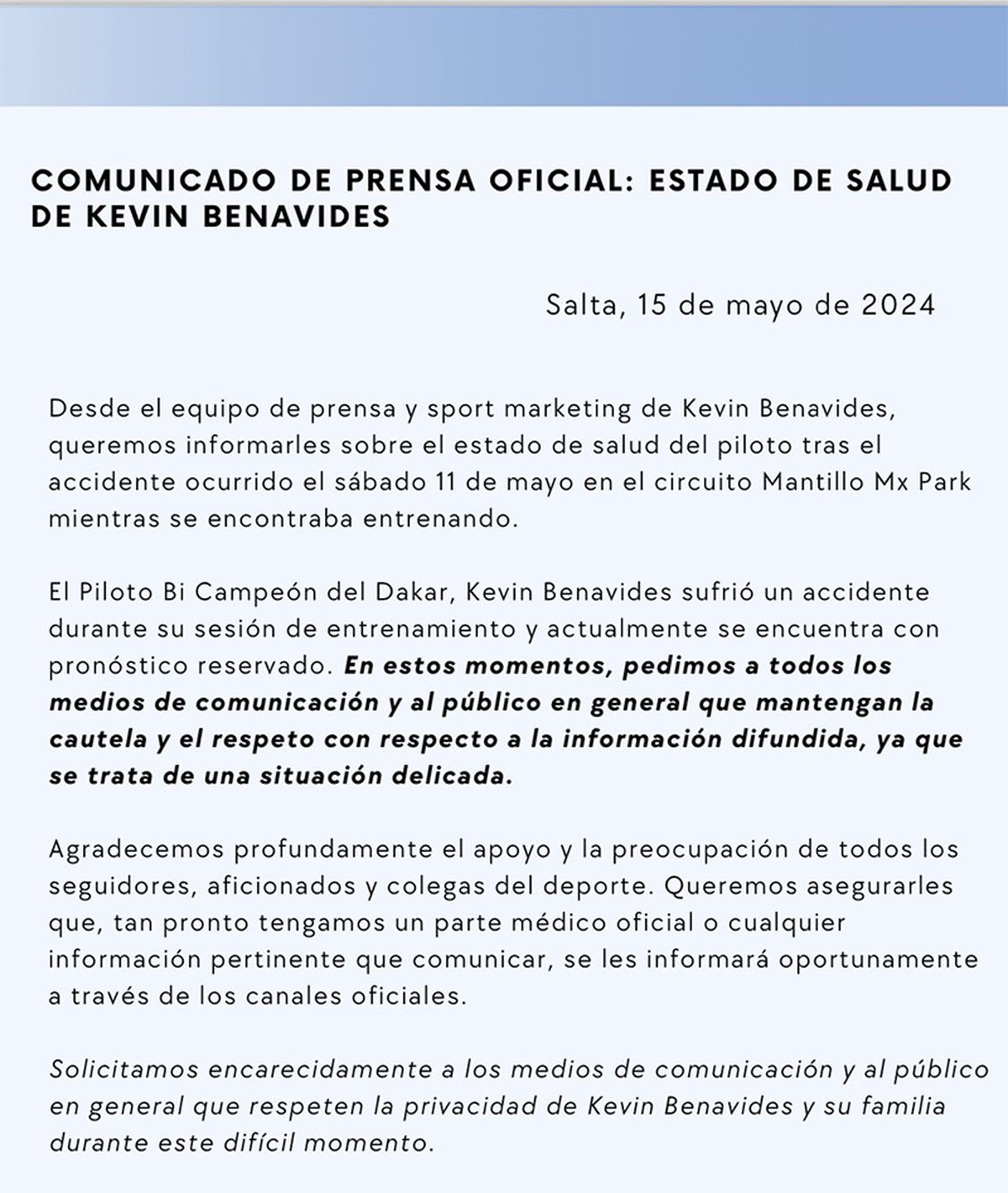 “El Piloto Bi Campeón del Dakar, Kevin Benavides, sufrió un accidente durante su sesión de entrenamiento y actualmente se encuentra con pronóstico reservado”, explicó su equipo de prensa en el comunicado sobre su estado de salud.