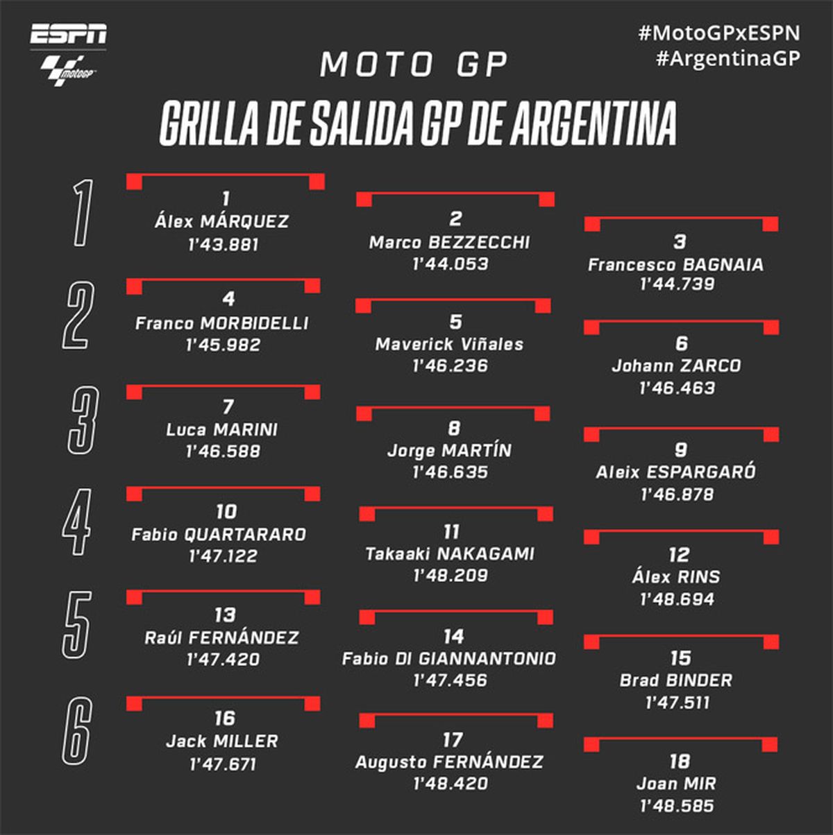 "Salir de la pole position es algo muy positivo pero todavía quedan dos carreras por afrontar. Me he caído con la primera moto, sólo teníamos una para seguir y por suerte el equipo reaccionó muy bien", destacó el menor de los Márquez, que también partirá desde la primera línea en la Sprint Race que se disputará este sábado a las 15:00 con transmisión de ESPN y Star+.